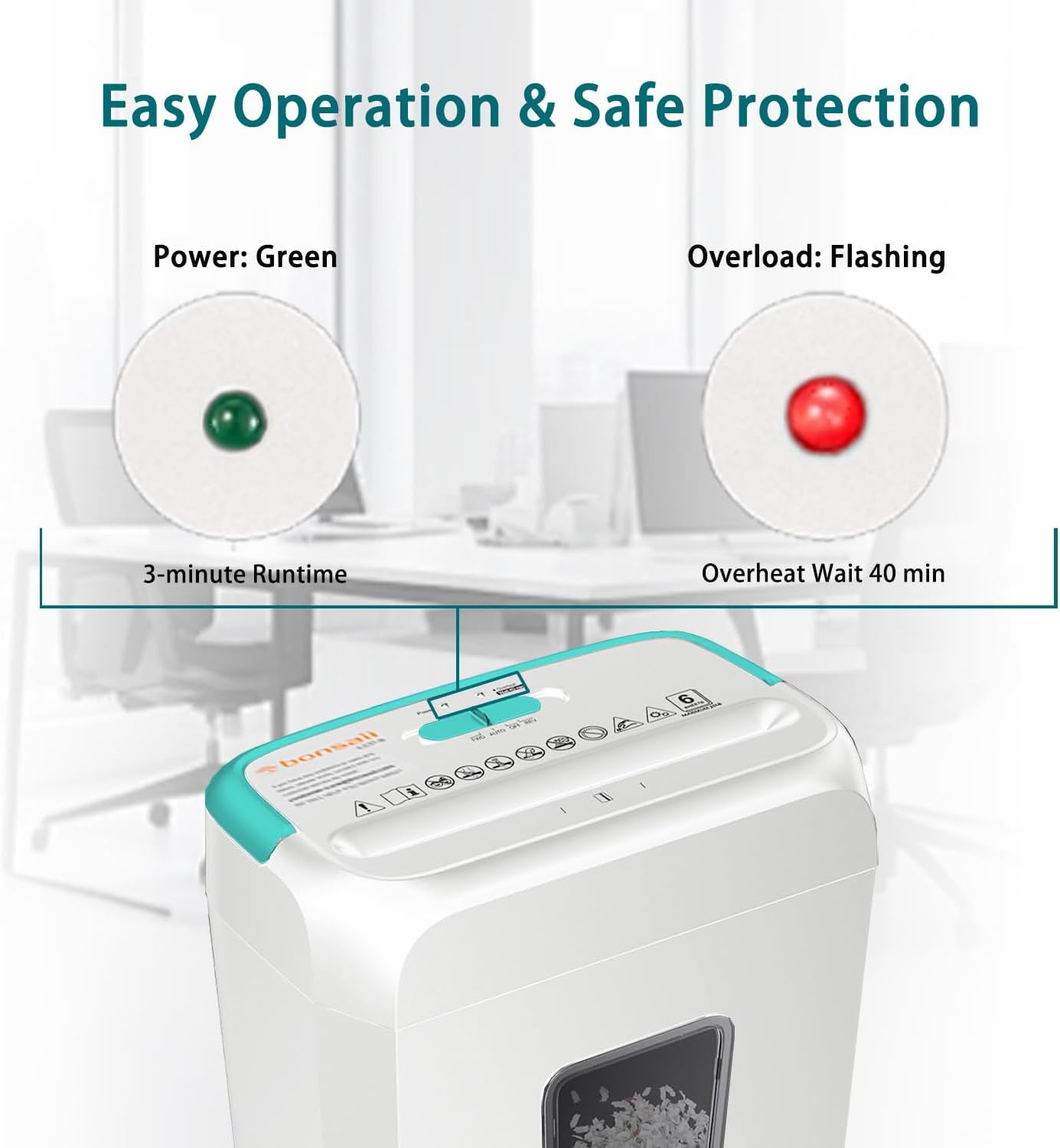 - 3-Minute Continuous Shredding: Can shred about 100 sheets in 3 minutes. Over 3 minutes may cause overheating and automatic shutdown, requiring 40 minutes of cooling.