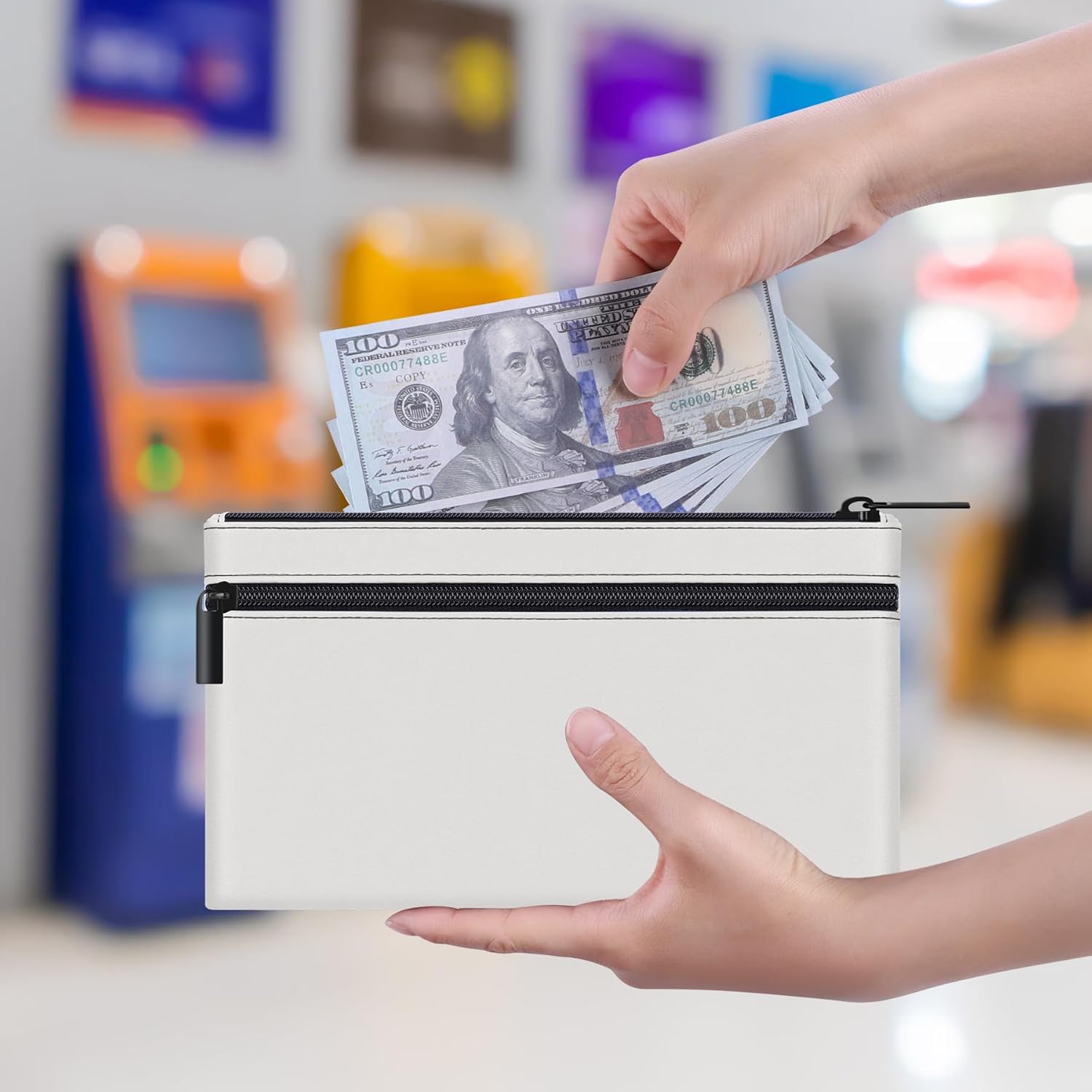 HAUTOCO Money Bag with Zipper 11x6.1 inch Money Pouch with Lined PU Leather Bank Bag Two Pockets Utility Wallet for Cash Check Receipt Coins Cosmetics, White
