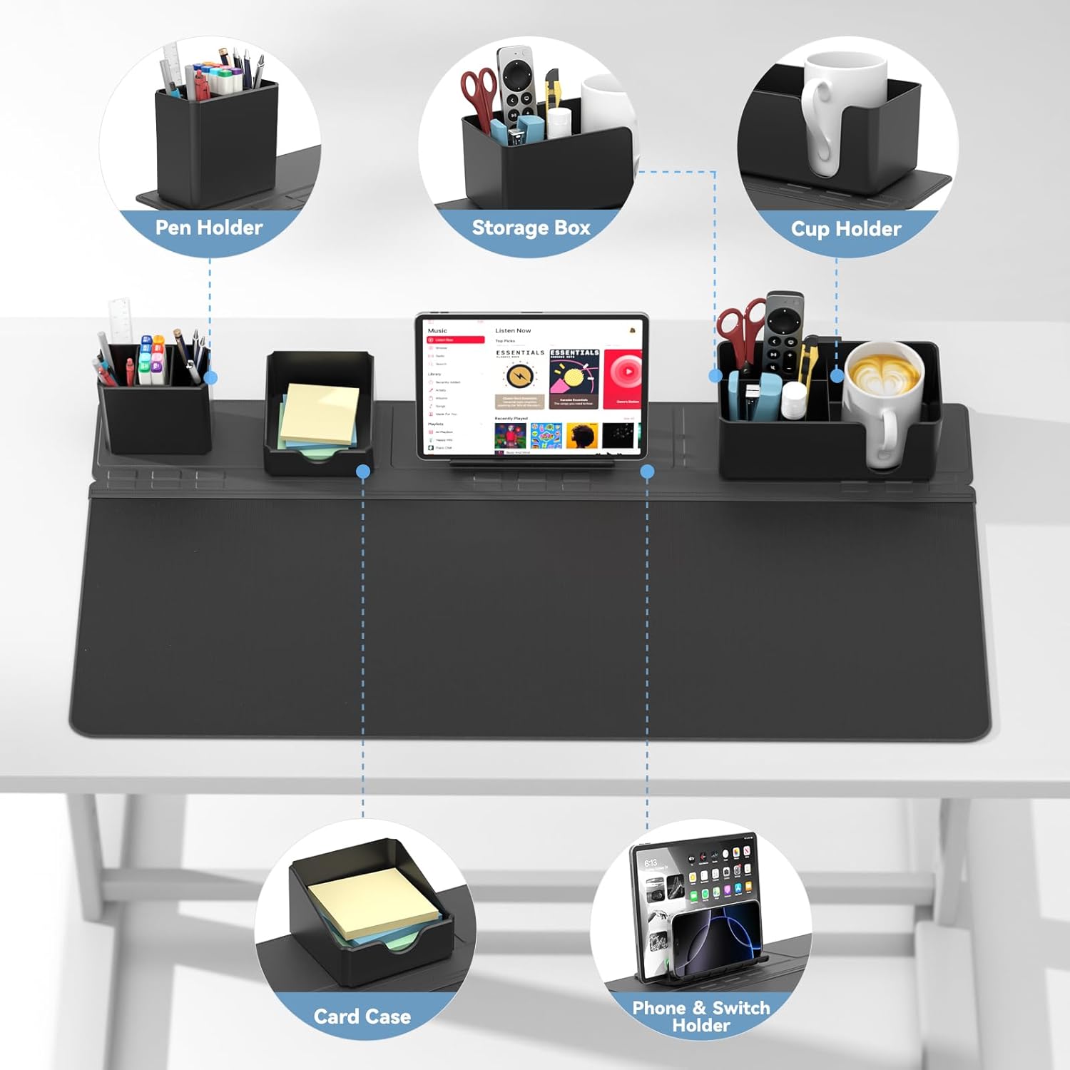 - 5-in-1 Desk Pad Organizer Set- This multifunctional desk mat and organizer set includes a large mouse pad, a phone and tablet stand, a pen holder, a storage box with a cup holder, and a card box, providing a comprehensive solution for your desk organization needs. Enjoy a tidy desk with everything within easy reach!