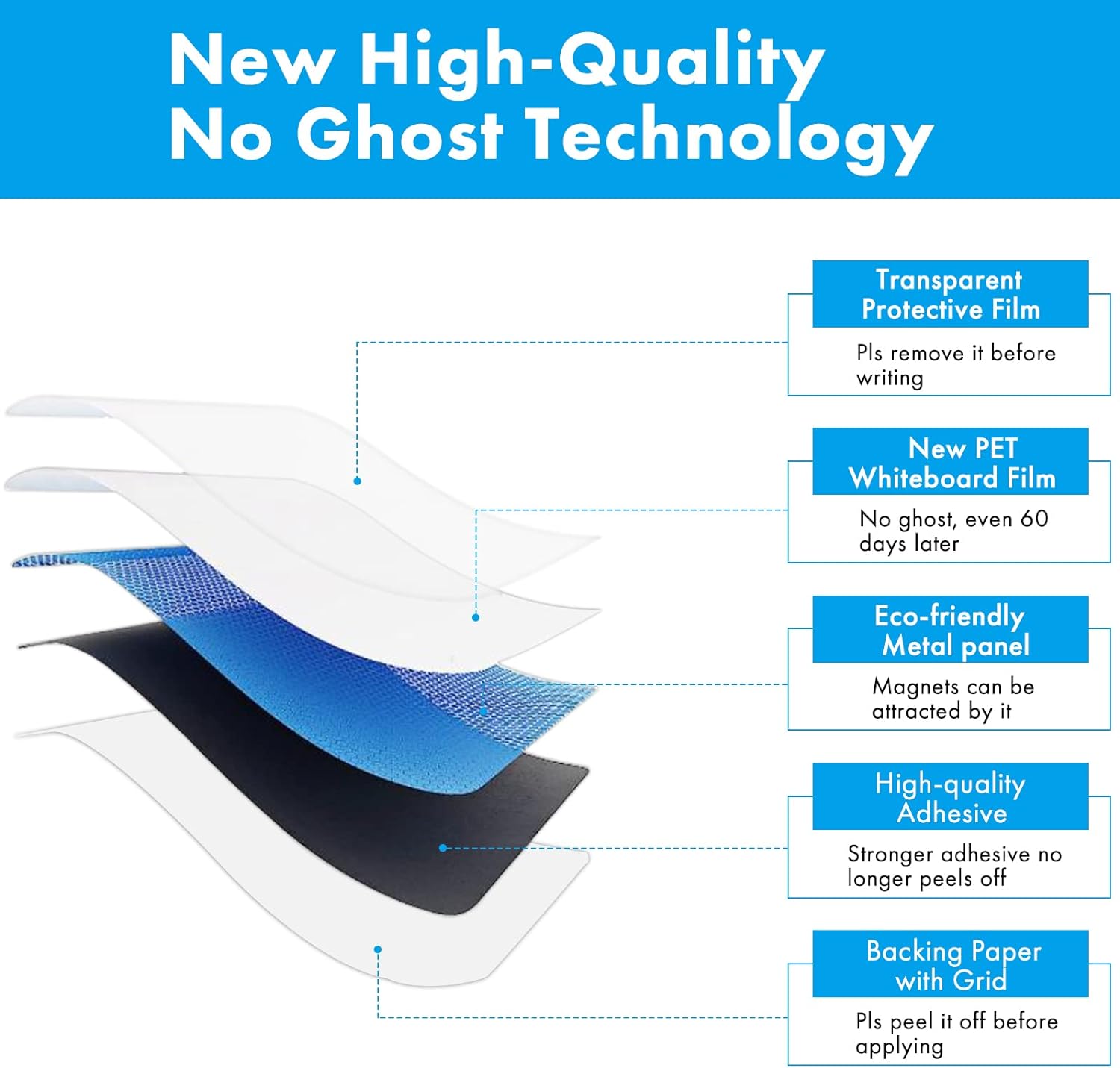 - NO GHOST – Upgraded the stain-resistant technology, even if leave drawing on it for 60 days, they still erase with ease. NOTE: pls REMOVE the TRANSPARENT PROTECTIVE FILM on the whiteboard before using it.