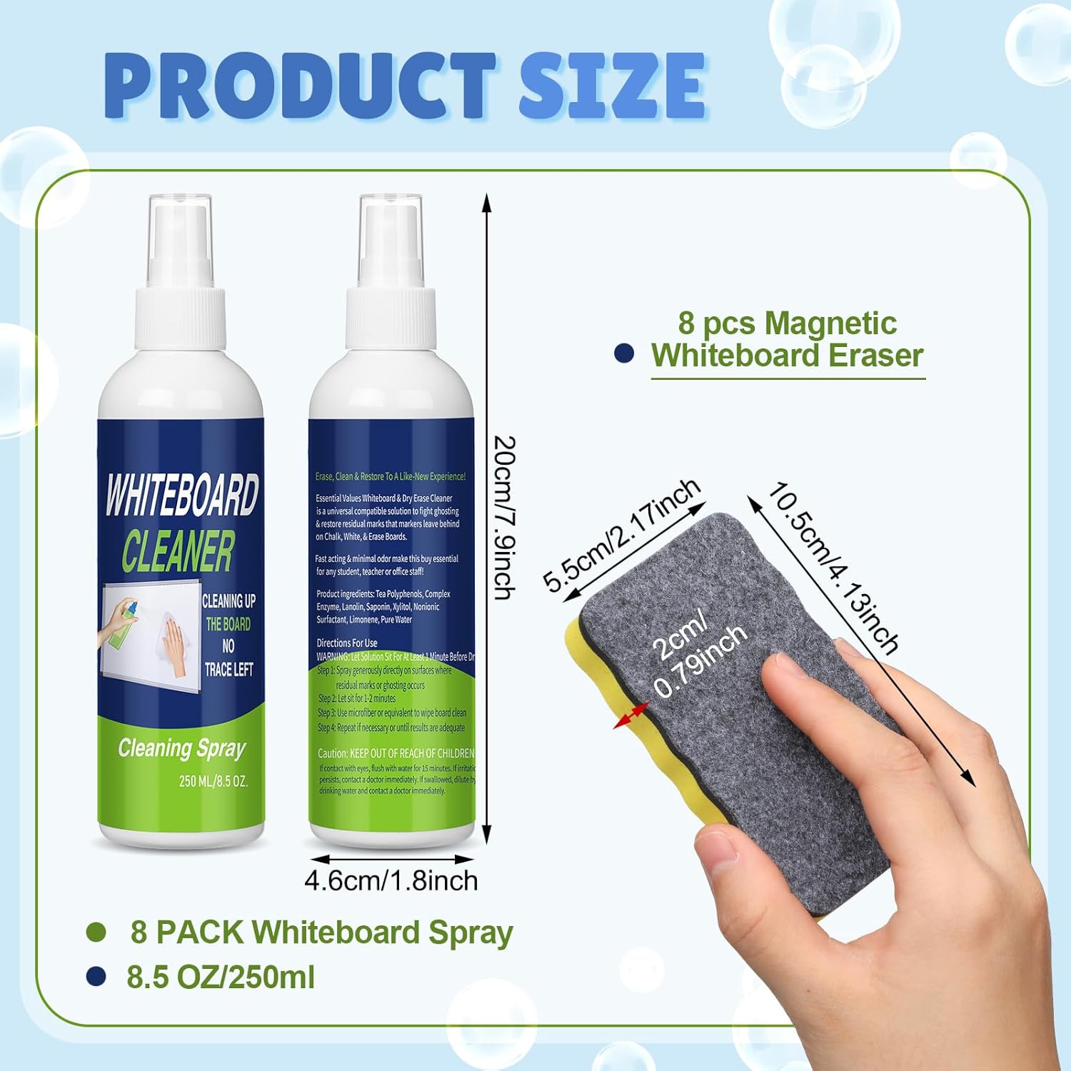 16 Pcs Dry Erase Whiteboard Cleaner Set, 8.5 fl oz Whiteboard Cleaning Spray Dry Erase Board Liquid Cleaner with 8 Magnetic Chalkboard Board Erasers for Classroom Home Office