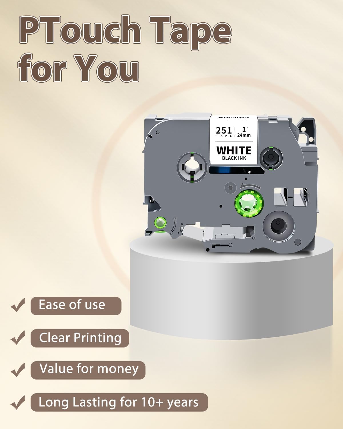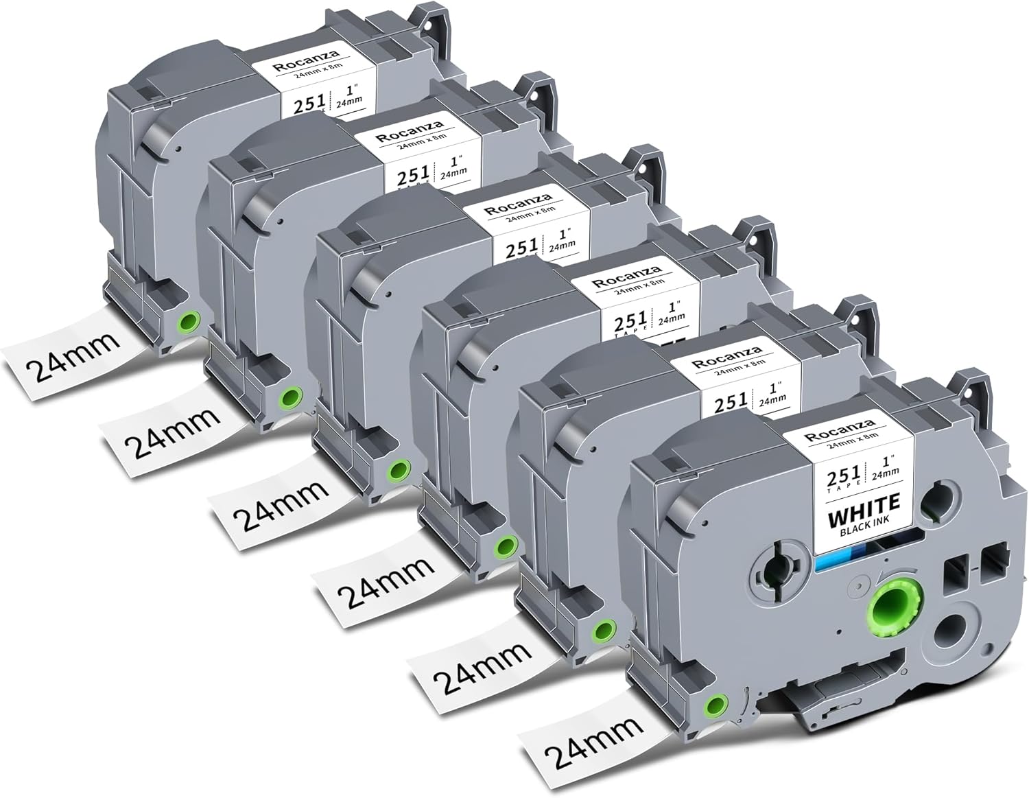 Replace for Brother TZe-251 24mm 0.94 Laminated White TZ Tape TZe251 PTouch Tape 1 Inch Work with Brother P Touch D600 E500 P700 P710BT P750W P910BT D410 PTD460BT D610BT Label Maker, 6-Pack