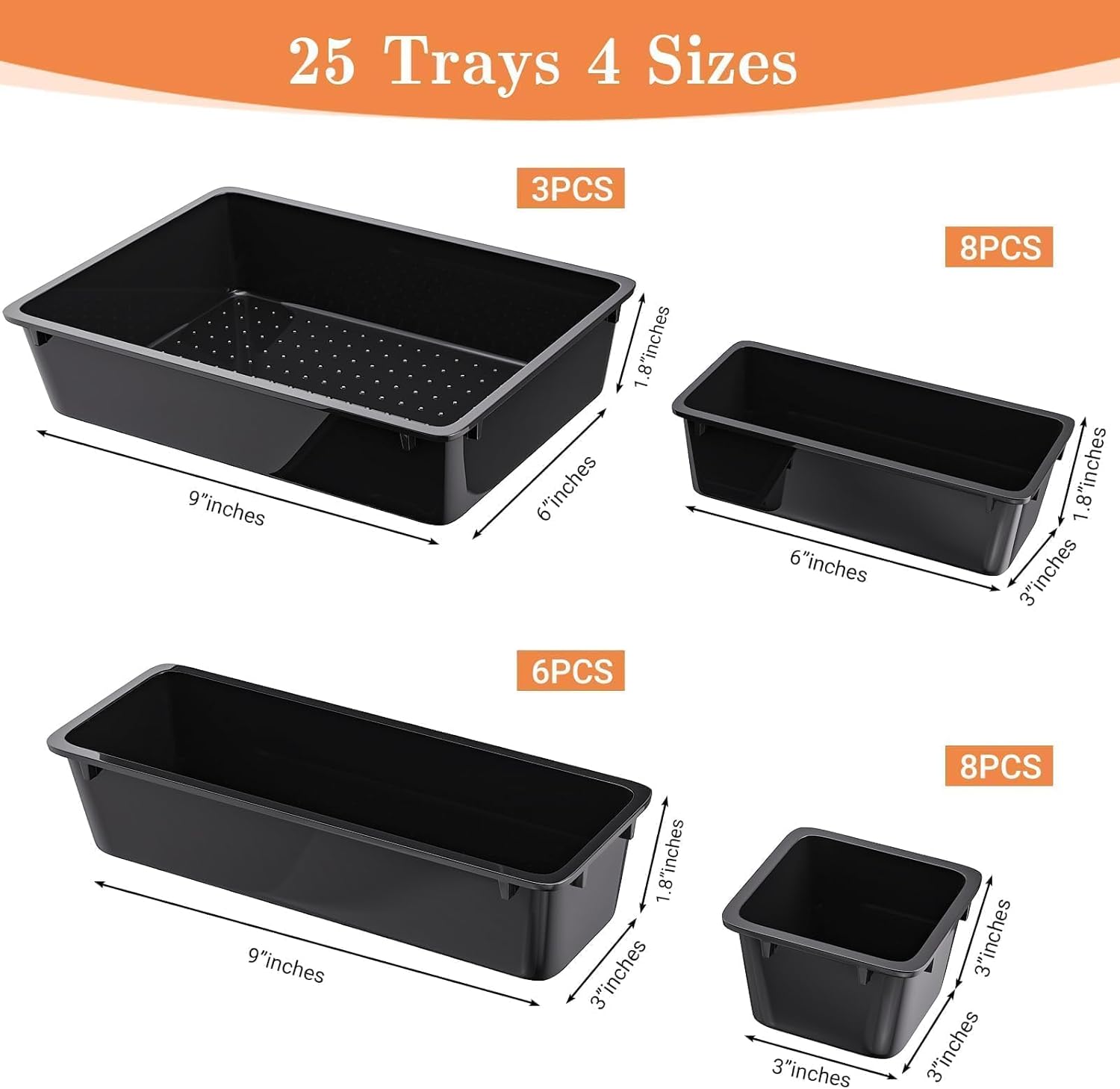 25 PCS Plastic Drawer Organizer Set, 4-Size Versatile Organizer Trays & storage Bins for Makeup, Jewelry, and Gadgets in Bathroom, Bedroom and Office, Black