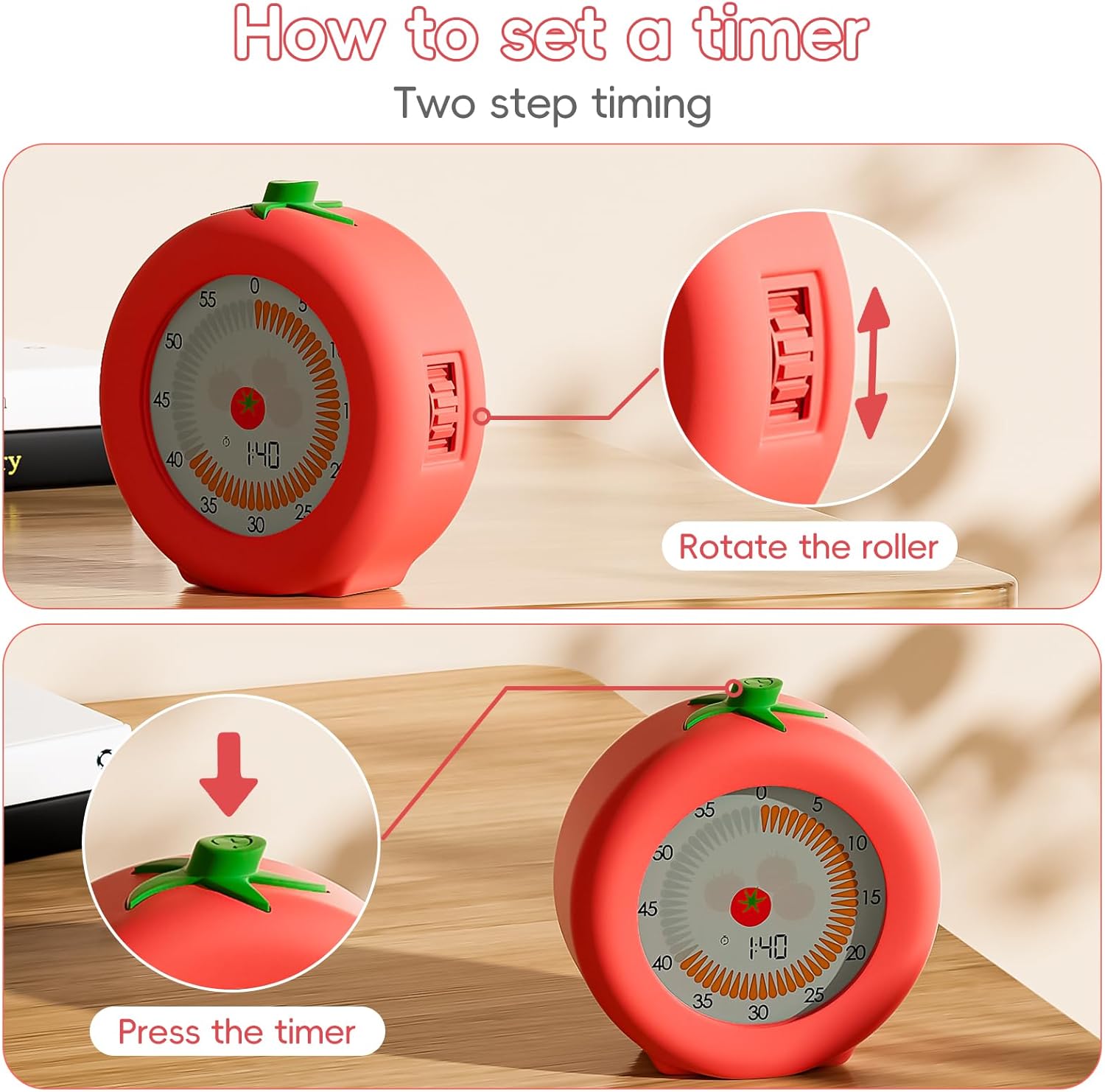 - Easy Timing: Just roll the wheel on the side of the timers to set the time. You can set the timer up to 299 minutes! Once the timer is set, you can focus on completing the task. The countdown will automatically notify you when it's time to finish