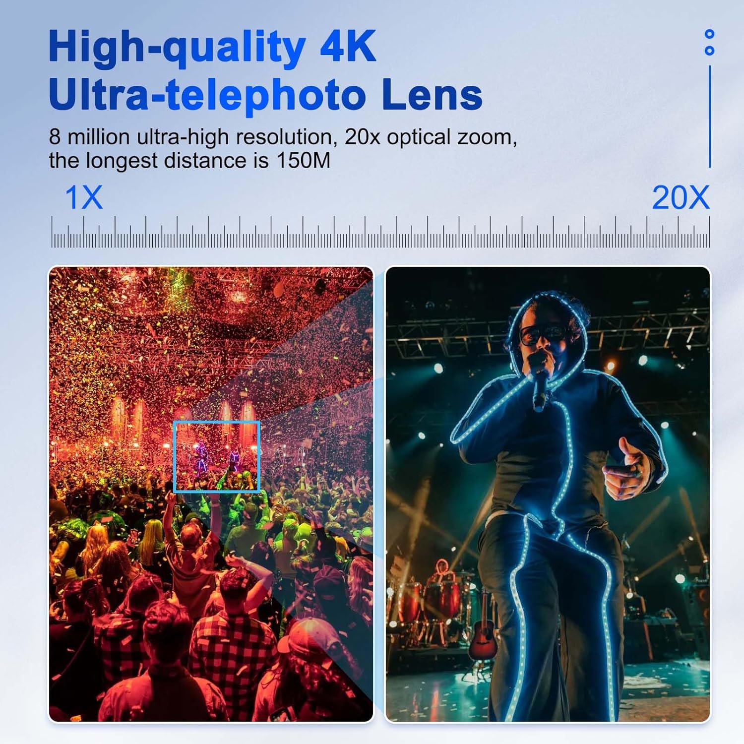 - 20x optical zoom: Adopting a new generation of upgraded 1/1.8-inch high-quality UHD CMOS sensor 4K ultra-telephoto lens, 8 million pixels ultra-high resolution, it can achieve 4K (3840x2160) ultra-high resolution high-quality image quality. And backward compatible with 1080p, 720p and other resolutions. 20x optical zoom, maximum field of view up to 60°.