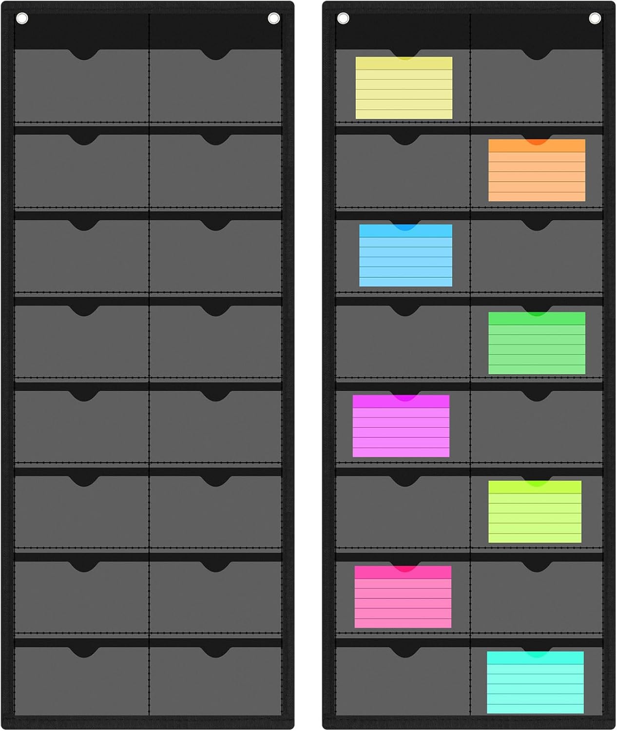 2 Pack 3'' x 5'' Index Card Holder Sleeve 16 Slot Plastic Organizer Hanging Wall Mount Business Note Cardholder PVC Clear Organizer Pocket for Classroom Office Library Home (Black)