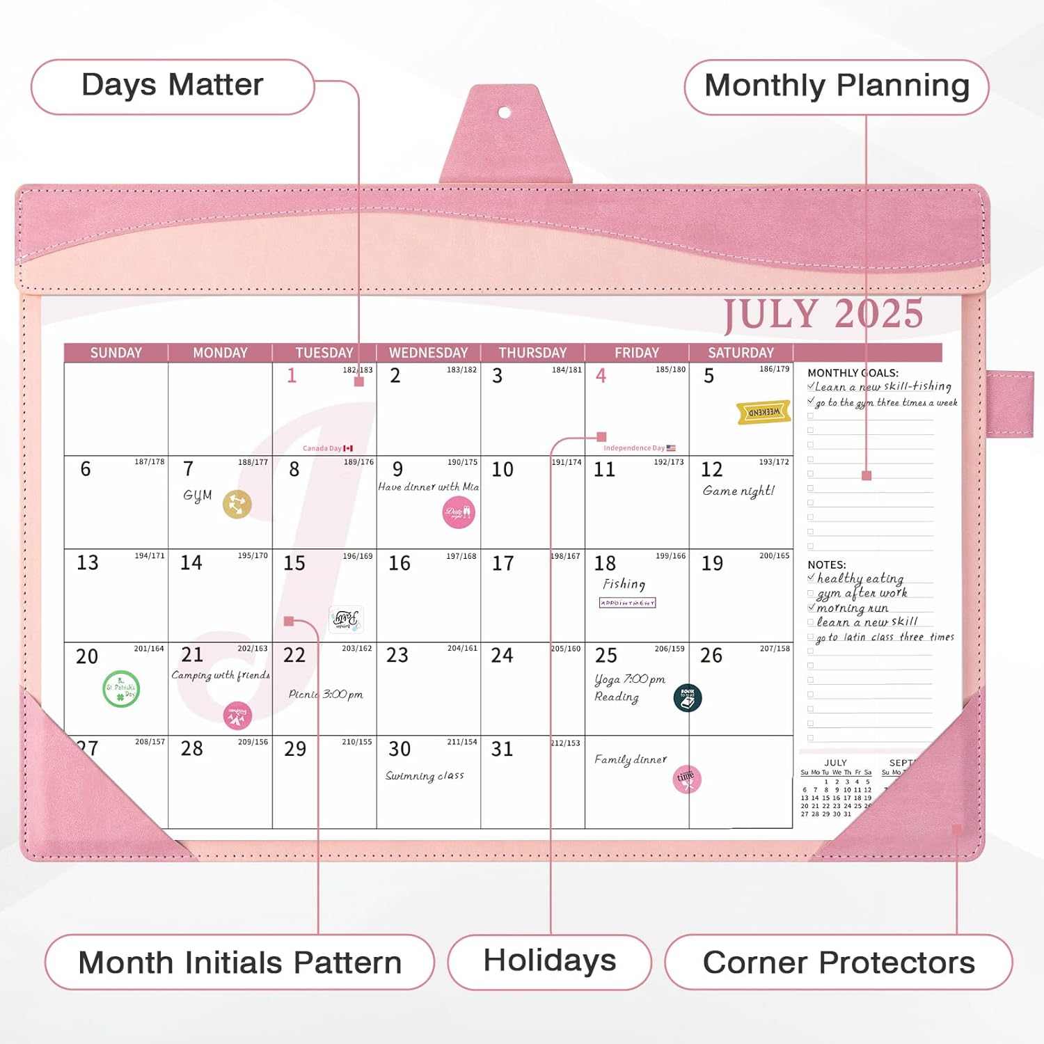 - Durable and Functional Use: Plastic cover can protect the calendar from dust and water pollution;the corner protectors can make the page corner of the calendar not easy to fold. Featuring a dedicated slot for pens, this functional loop keeps your favorite writing tool neatly stored and always within reach.