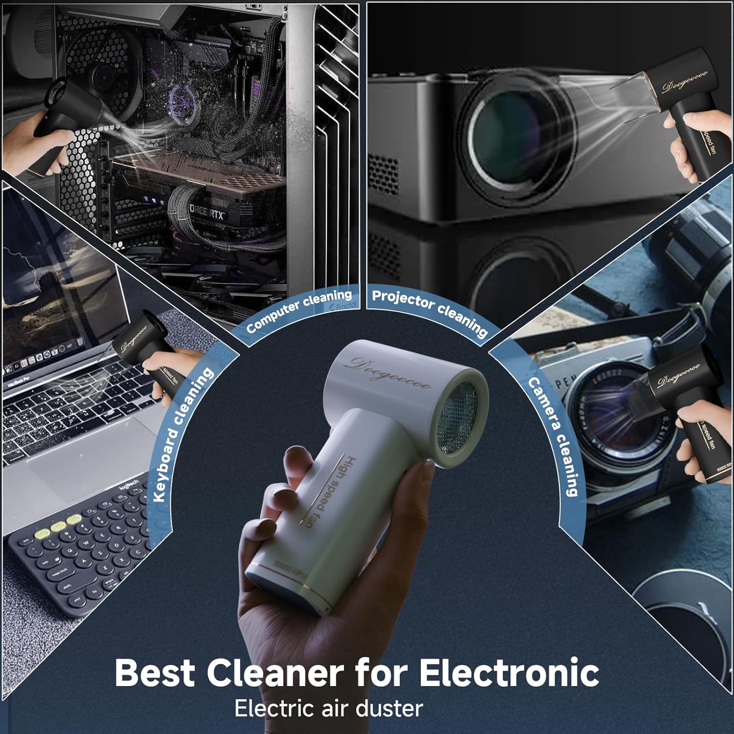 - [Upgraded MINI Compressed Air Duster] - Made with industry-leading 3C power battery technology. The power increased by 30%, durability increased by 100%, and usage time increased by 200%; Besides, this electric cordless air blower has 5 gears adjustable. The size of only 5.1x2.4in and a weight of 398g. It is small and lightweight but powerful efficiently dust cleaning for computer, keyboard, air conditioner, home, car and outdoor. BTW, it also can make a fire.