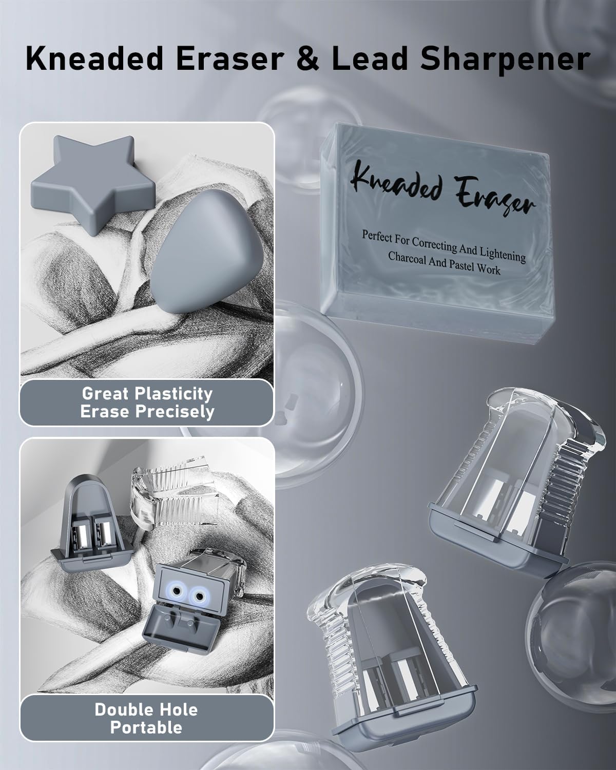 - 【Kneaded Eraser&Sharpener】Includes a kneaded eraser and a sharpener built into the cap of a 2.0mm lead holder, Two extra lead sharpeners are provided for 2.0mm leads to keep them fine when they become dull. The kneaded eraser is ideal for cleaning and blending charcoal, pencils in drawings.