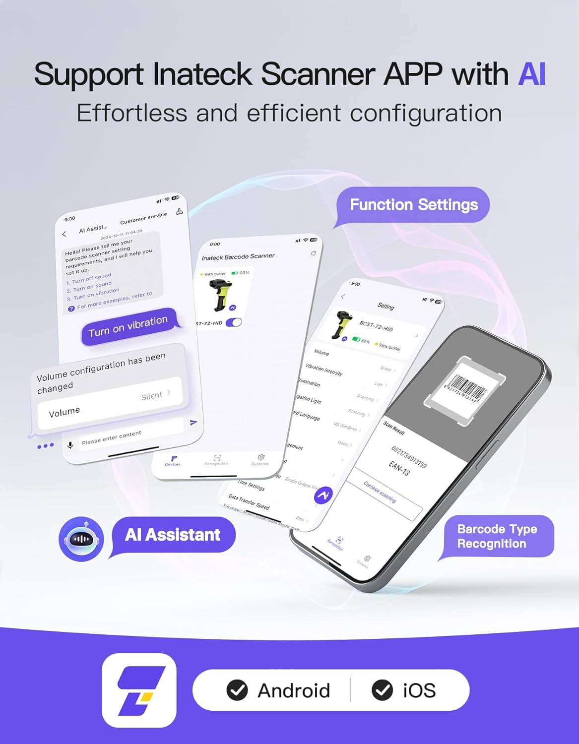 - Wide Compatibility & Versatile Scanning Modes: Supports 2.4G wireless, Bluetooth, and wired connections, compatible with Windows, Mac, iOS, Android, iPad OS, and Linux. Choose from manual, continuous, or auto-sensing scanning modes, with light, sound, and vibration notifications. Ideal for inventory management, storing up to 270,000 barcodes (13 characters each)