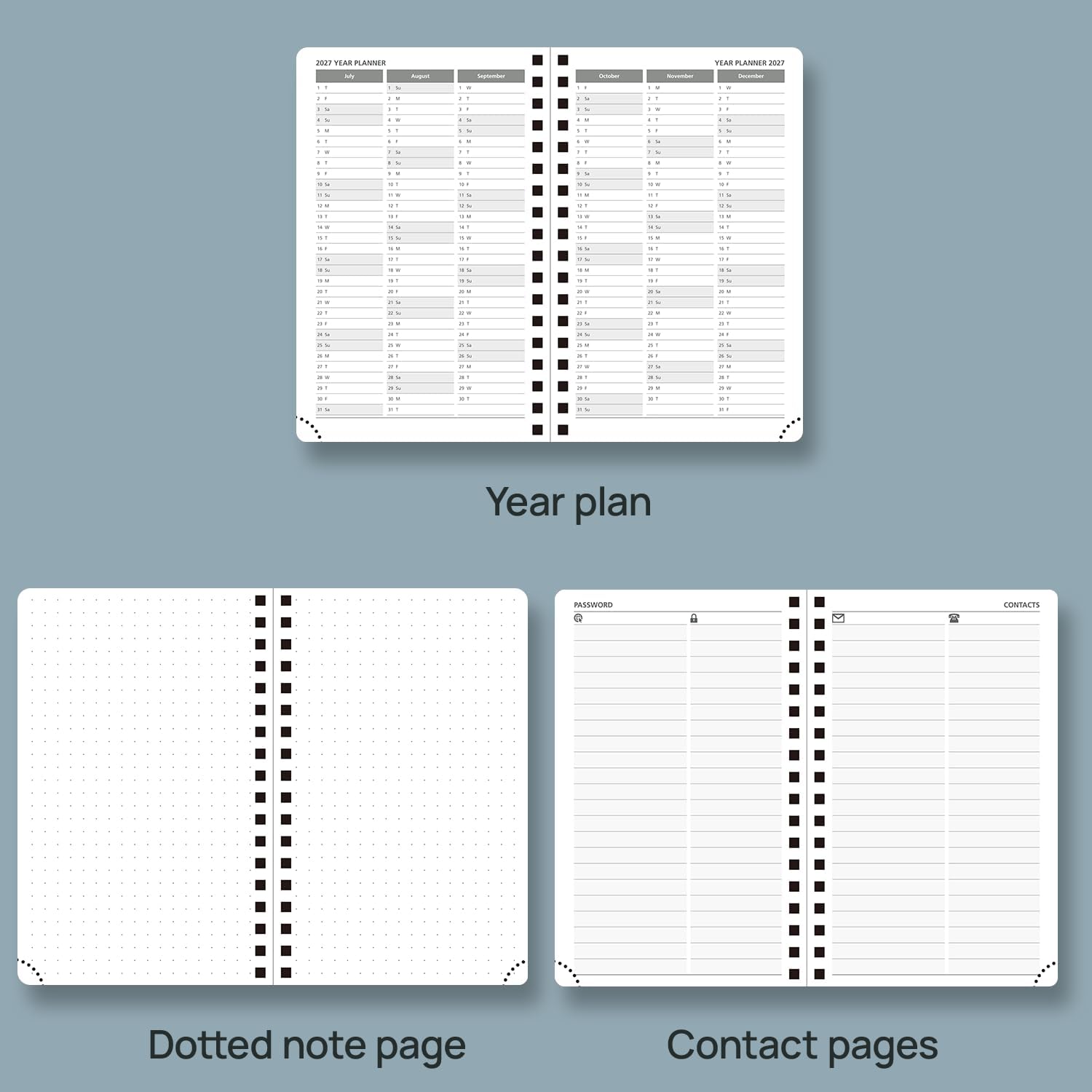 - EXTRA PAGES: This small planner 2026 also contains "2026-2027 Yearly Overview" Page + "2026-2027 Holiday & Calendar" Page + 3 Contact Pages +1 Password Page +53 Horizontal line page + 7 Dotted Notes Pages for jotting down your ideas, thoughts or any other happy things in detail.