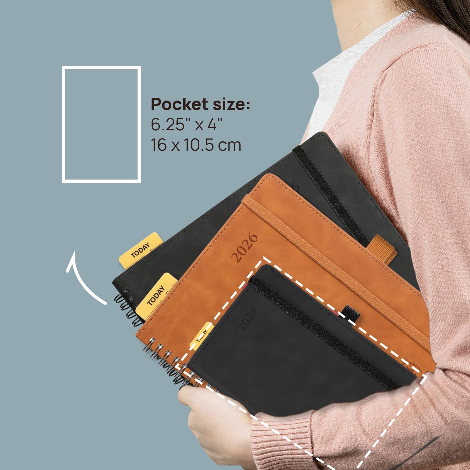 POPRUN 2026 Planner Weekly Notebook (Jan-Dec), Small Size 4''x 6.25'' - 2026 Pocket Calendar for Purse with Spiral Soft Cover, Plastic Ruler, Inner Pocket, 100 GSM - Black