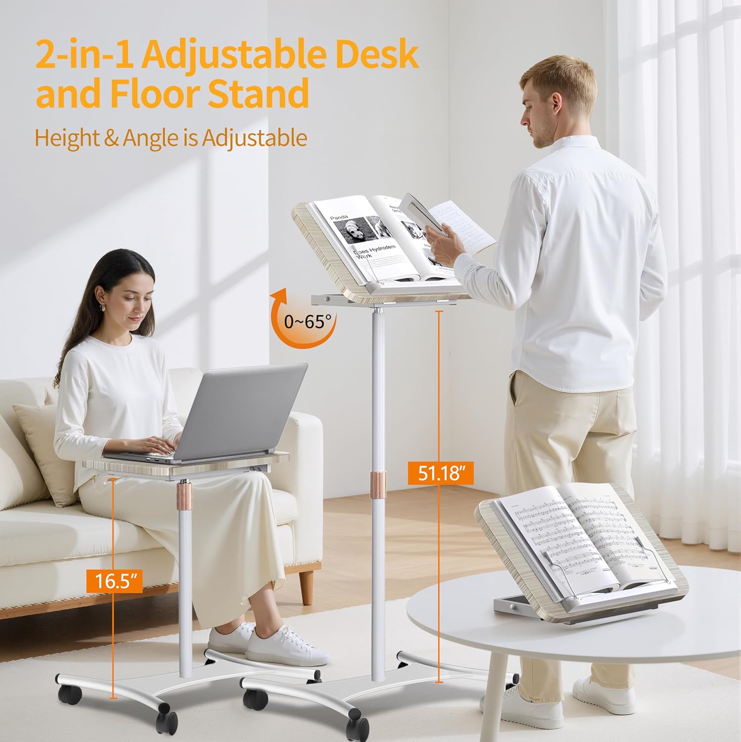 Rolling Laptop Floor Stand, Dual-Purpose for Desk & Floor, Adjustable Height from 16.5" to 51", with 4 Lockable Casters & Book Page Clips, Laptop Stand Ideal for Projectors, Books, Ipads (White)