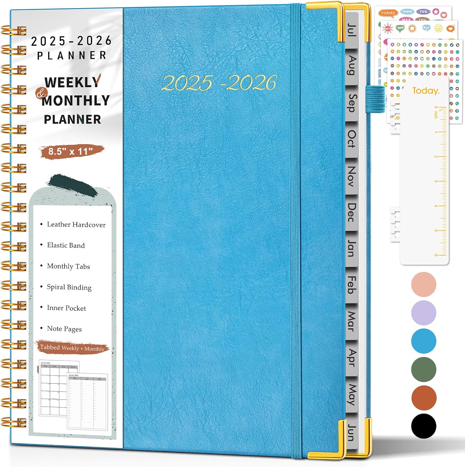 Academic Planner 2025-2026, Weekly and Monthly Calendar Planner from July 2025 - June 2026, 8.5" x 11" Hardcover Leather Hourly Appointment Book with Tabs, Spiral Daily Planners for College School Teacher Student, Sky Blue