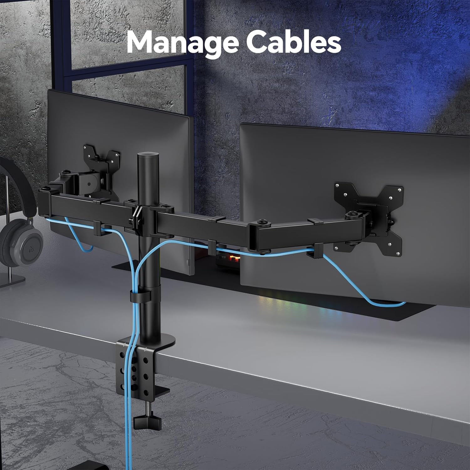 - Compatibility: Dual monitor mount fitting two screens 13” to 27” in size and up to 18 lbs in weight each with VESA 75x75mm or 100x100mm backside mounting holes. Cable management clips are provided along the arms and center pole.