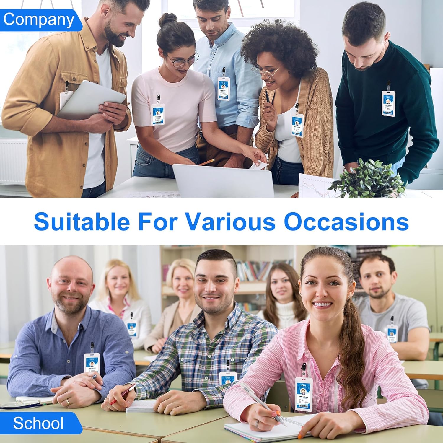 - Easy to apply: the ID badge clips can be rotated 360 degrees, flexible for using, the PVC straps are easy to install or remove, you can use them to attach your card holders to clothes, bags, badge reels and so on; The metal clips have 2 holes that are pre punched, which help you to hang or clip the holder in a variety of ways