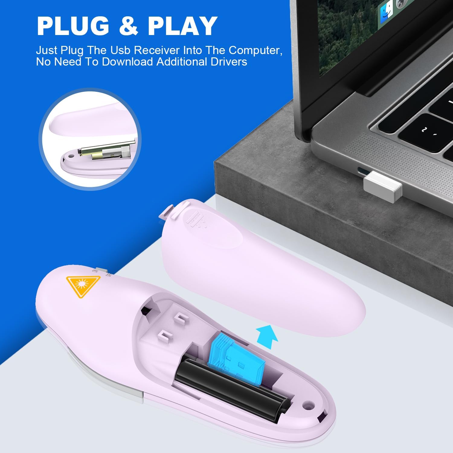 - Easy to Plug & Play: Designed for easy use, this wireless presenter requires no software installation. Just insert a AAA battery (not included), plug the 2.4GHz USB receiver into your computer, and you’re all set. It’s a must-have for classrooms, boardrooms, and beyond