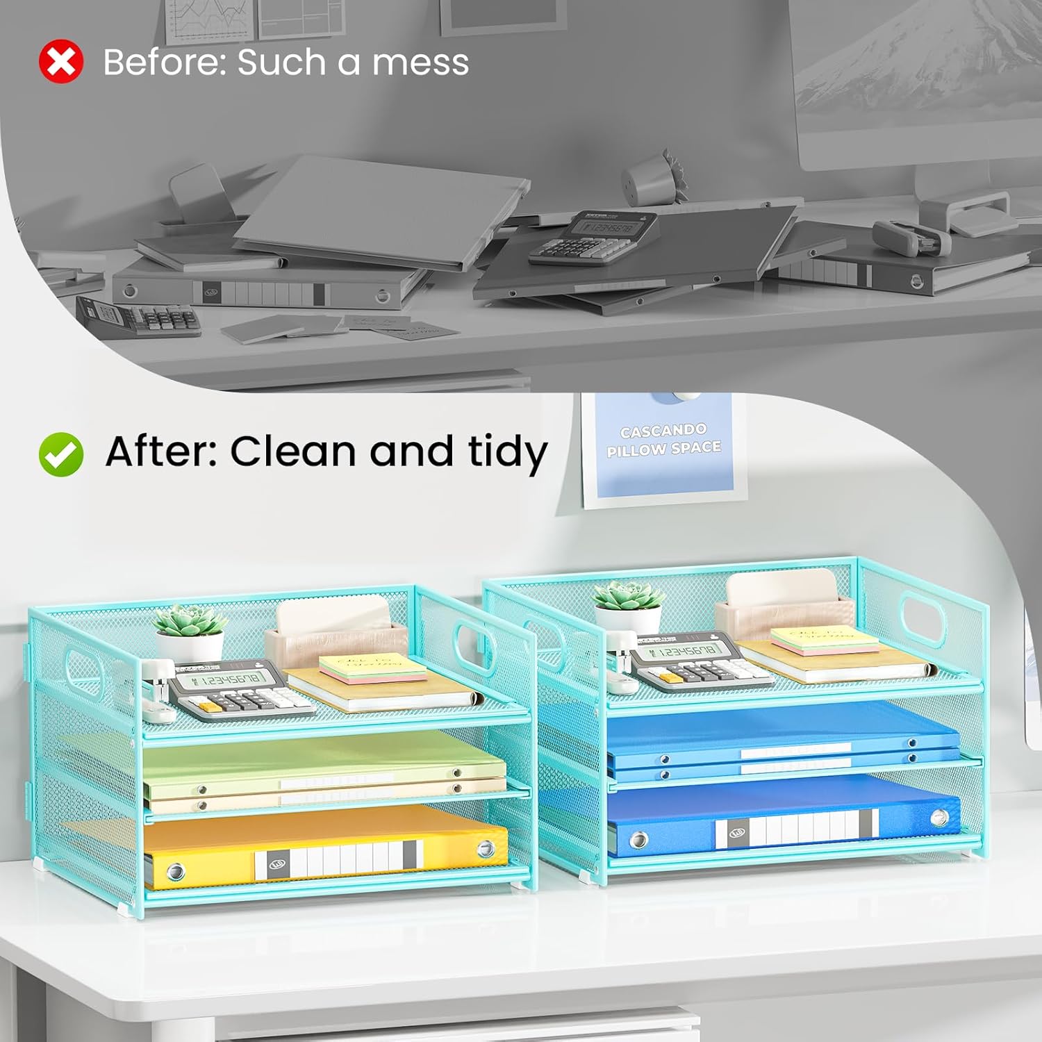 Subekyu 2-Pack 3-Tier Blue Metal Mesh Desk Paper Letter Tray & File Sorter Organizer with Handle + 1 Sliding Tray for Desk, Home, Office, School Supplies, A4 Paper and Accessories Storage