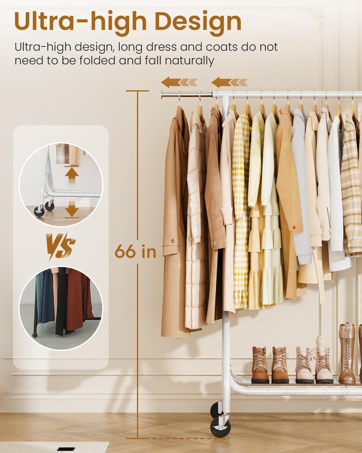 Heavy Duty Clothes Rack, Metal Clothing Rack Load 450 LBS, Rolling Coat Racks for Hanging Clothes with Lockable Wheels, Wardrobe Closet Garment Racks for Bedroom, White