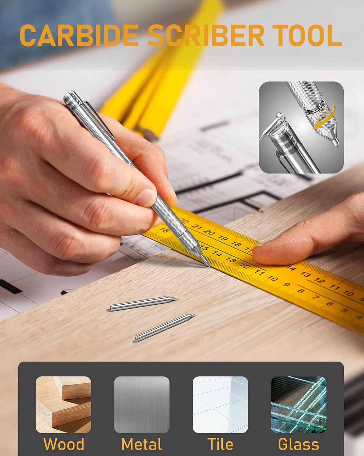 - DEEP HOLE MARKER PENS: These long-tip, waterproof Marker Pens are perfect for marking on hard-to-reach surfaces such as glass, metal, and plastic—where traditional woodworking pencils may not suffice. The set's versatility is enhanced by these deep hole markers, offering precise marking across a variety of materials
