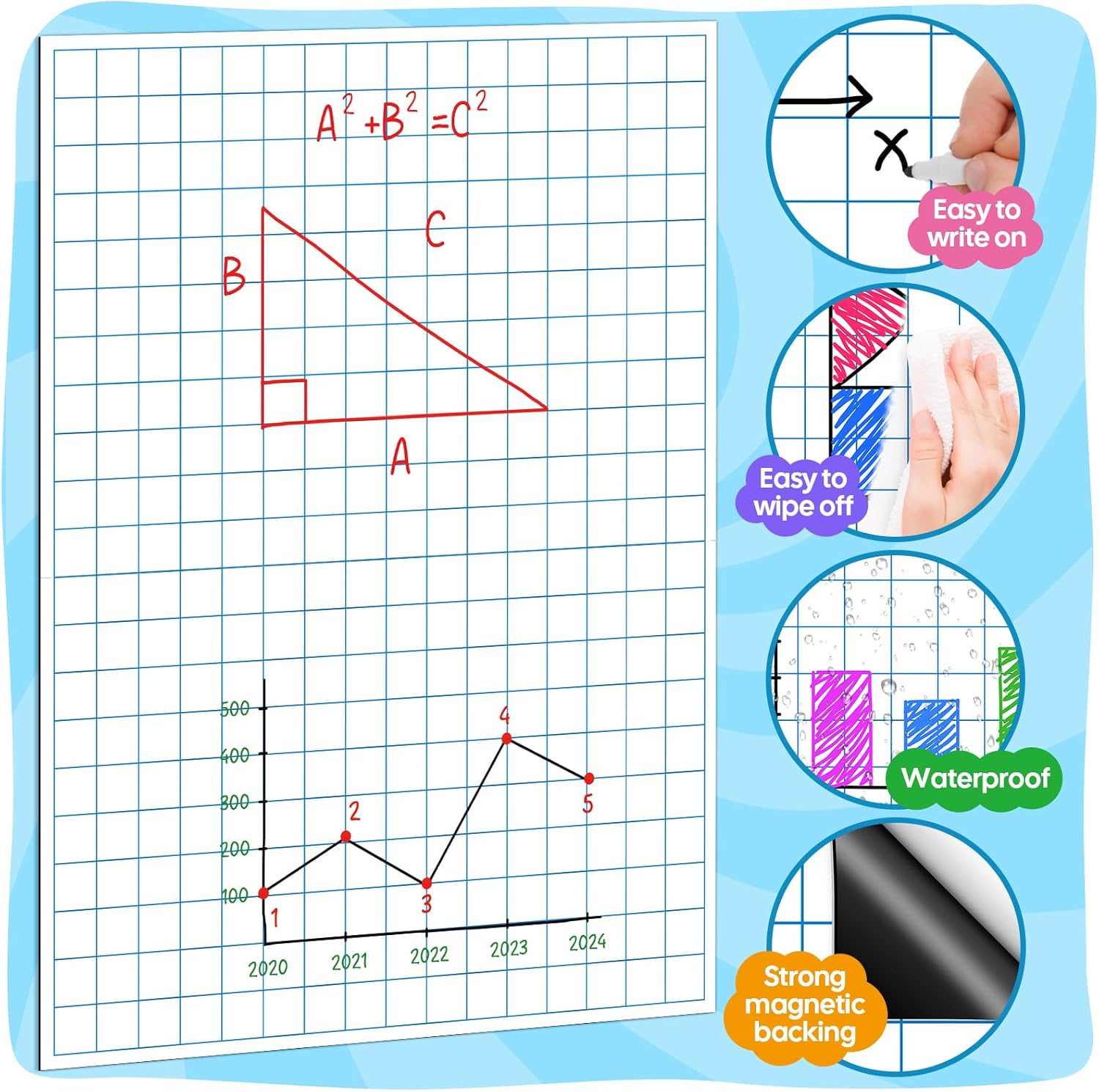 - Giant Magnetic Graph Paper: Measures 21.3" x 16.5" ((comes as two separate sheets), offering generous writing or graphing space that's clearly visible from across the room. Ideal for teachers to demonstrate writing, plot graphs, solve math problems, and engage students more easily—making classroom instruction smoother and more effective.