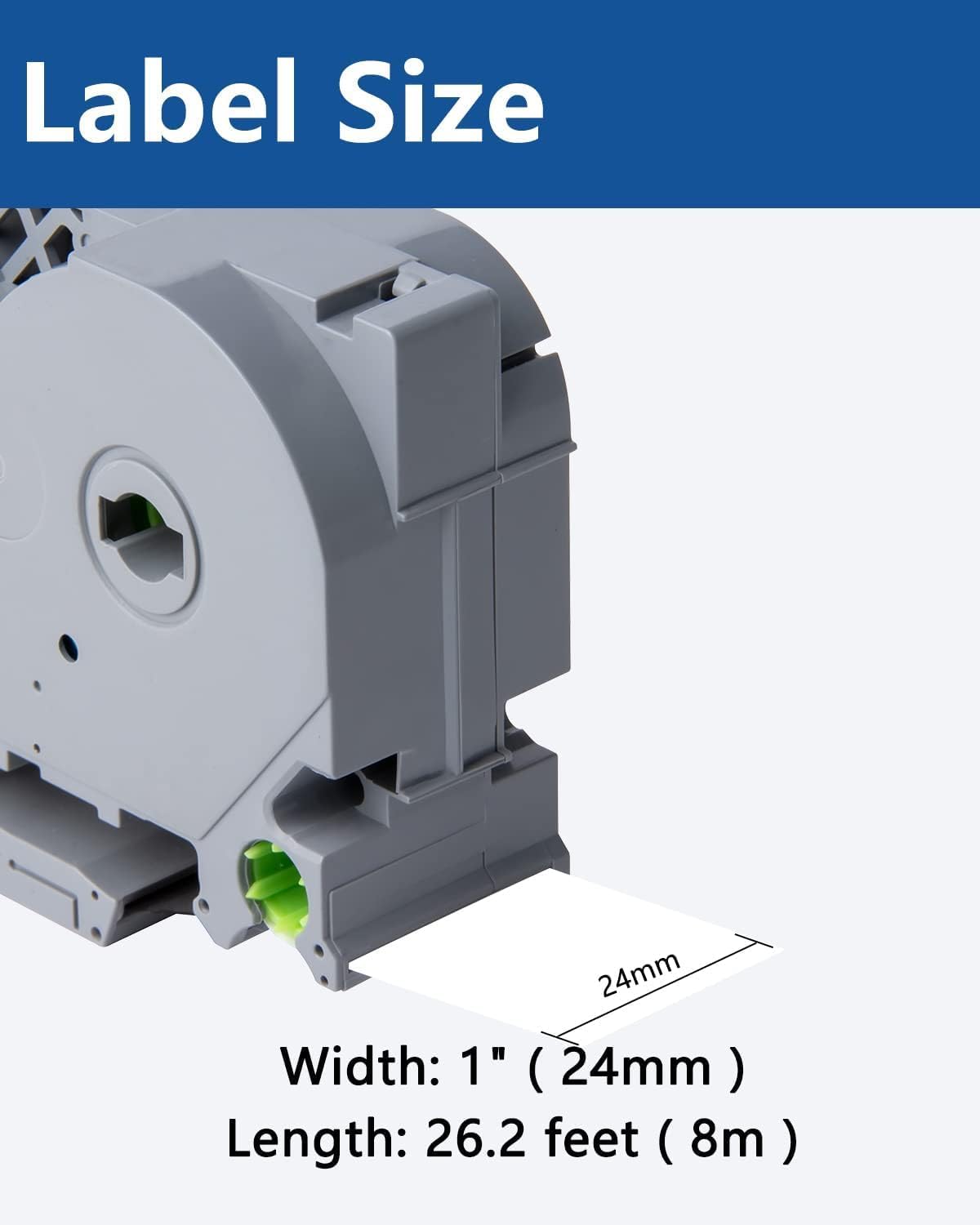 - Size - 0.94" width x 26.2' length ( 24mm x 8m ) each 24mm label maker tape. Color - Black ink on white tape