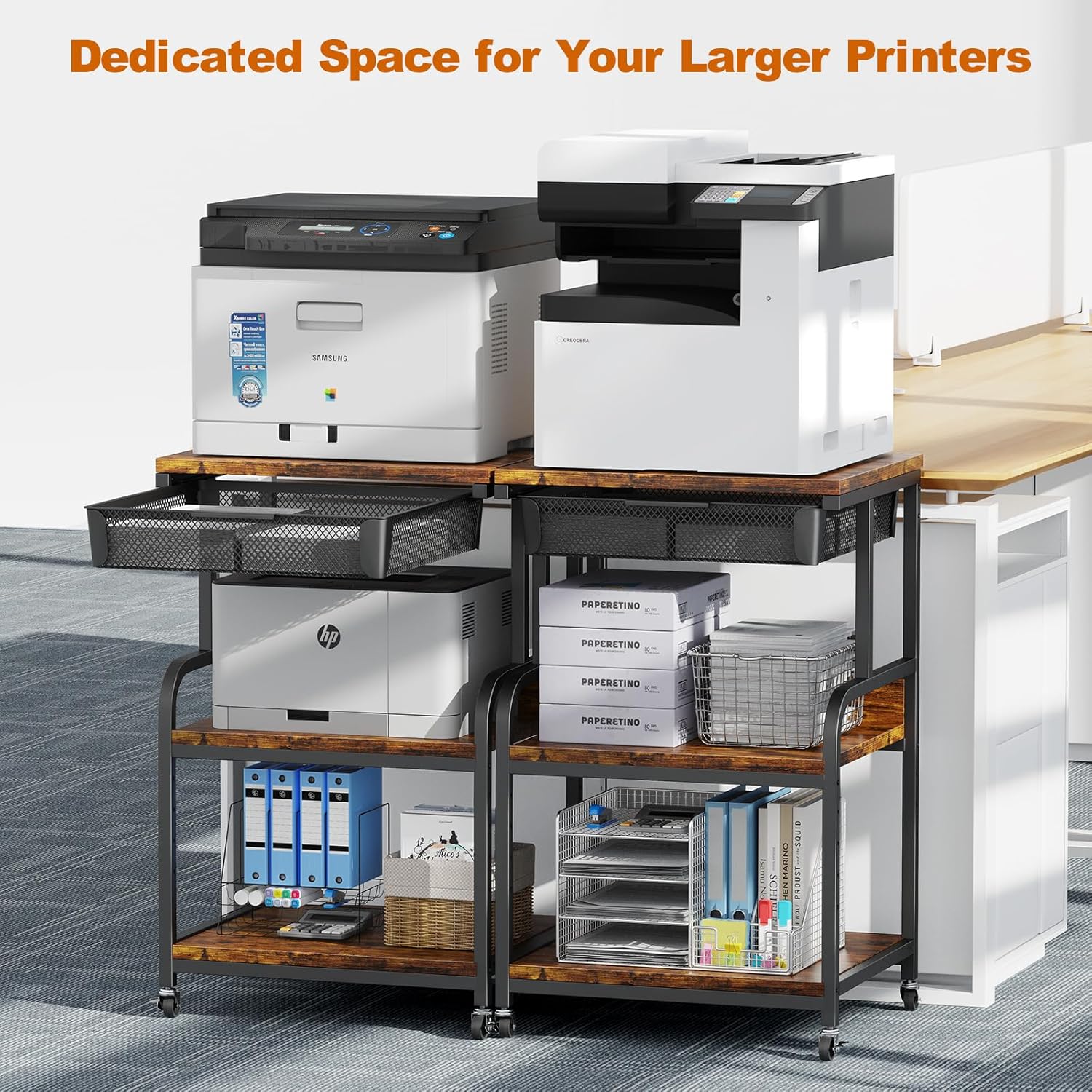 - 【Two Installation Choices】The office stand can be used with or without wheels. Not only does it make it easy to move the printer around without having to manually lift it, but it also makes it easy to clean underneath the 3-tier dual printer stand.