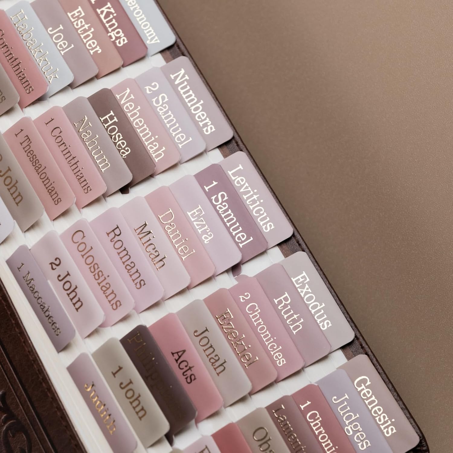 - Large Print, Easy to Read & Easy to Install:Silky velvet touch laminate,carefully designed pretty Bible accessories . The peel-and-stick Bible index tabs are self adhesive, simply align them with the provided guide or place them creatively.