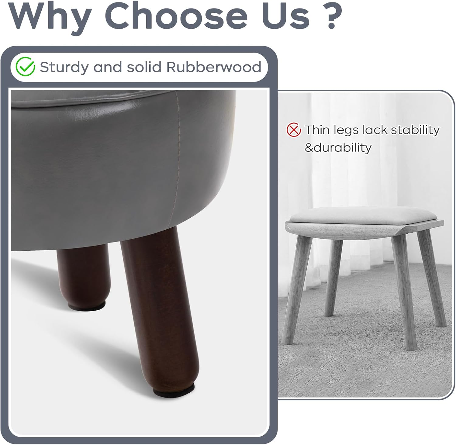 - 【Anti-Slip Design】- These leather foot stools small ottoman rubber legs come with dedicated felt pads to prevent scratches on floor and keep it from sliding.Wood leg with non-slip felt pad is quiet when moving, and can avoid leaving scratches on floor.The small footstool is perfect for small spaces and is compact enough not to get in anyone's way.