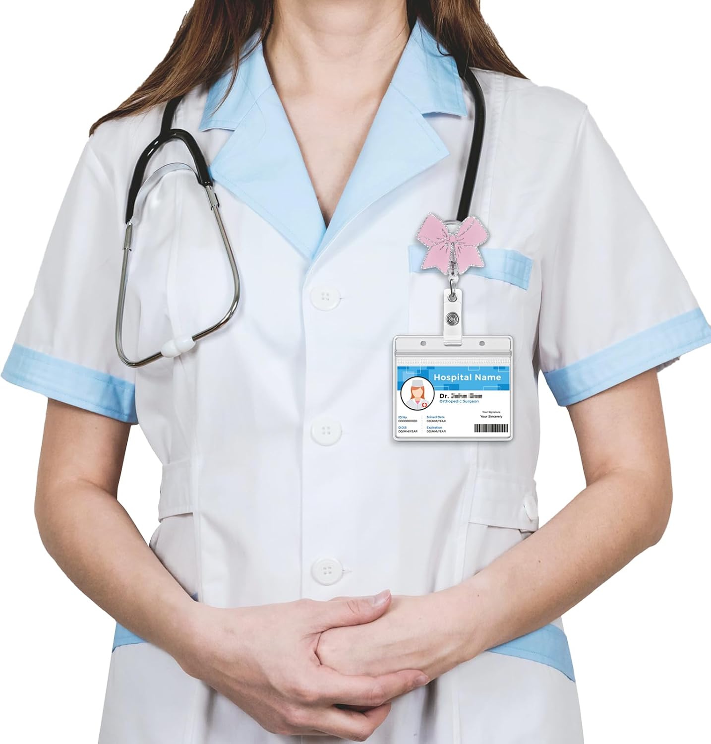 Cute Badge Reel, Pink Bow Badge Holder, Nurse Name Badge Reel with Retractable Clip, Medical Worker ID Card Holders, Pediatric Nursing Accessories for Nurse Doctor Student Teacher Office