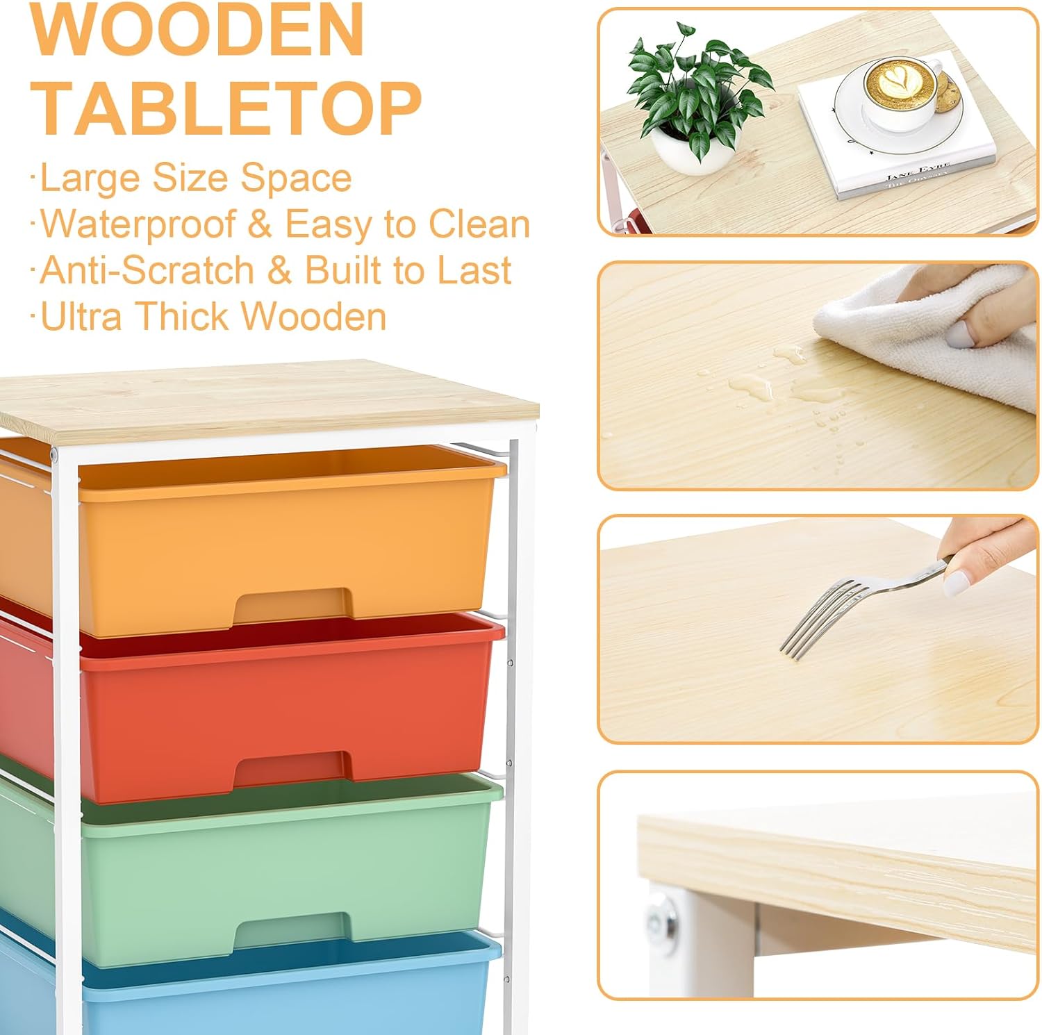 - WOODEN TABLETOP & THICK DRAWERS: Utility cart with drawer boasts a sturdy and durable powder-coated steel frame with water and rust resistance ensures a sturdy construction and built to last. Additionally, the slide-out drawers are made of durable PP material, which also boasts great durability. Holds 33 pounds on tits op plate and 11 pounds per drawer.
