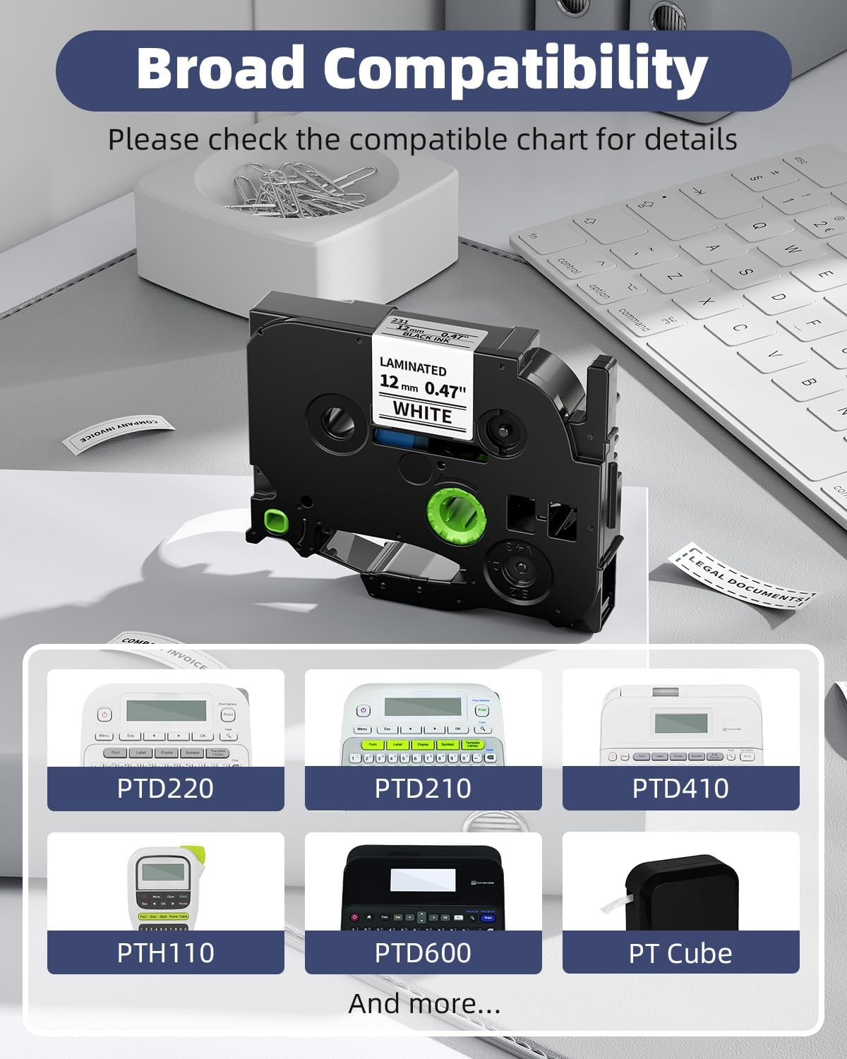 - Laminated & Long-Lasting: replace for tz tape 12mm 0.47 laminated white withstands water, fade,sunlight and high/low temperature from -22° (-30°C) To 258° (120°C)