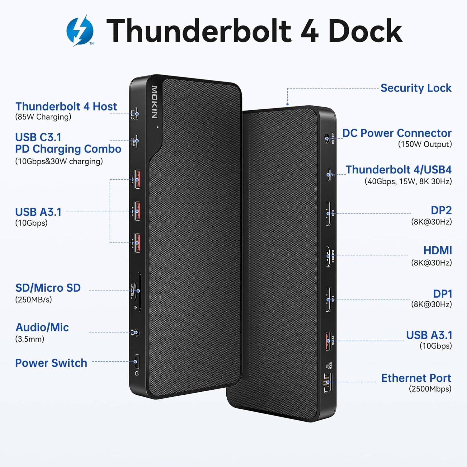 MOKiN Thunderbolt 4 Dock - 16 Ports, Laptop Docking Station Dual Monitor for MacBook, Docking Station 3 Monitors for Windows with 150W DC Power,TB4 Cable,2.5 Gigabit Ethernet(Thunderbolt™ Certified)