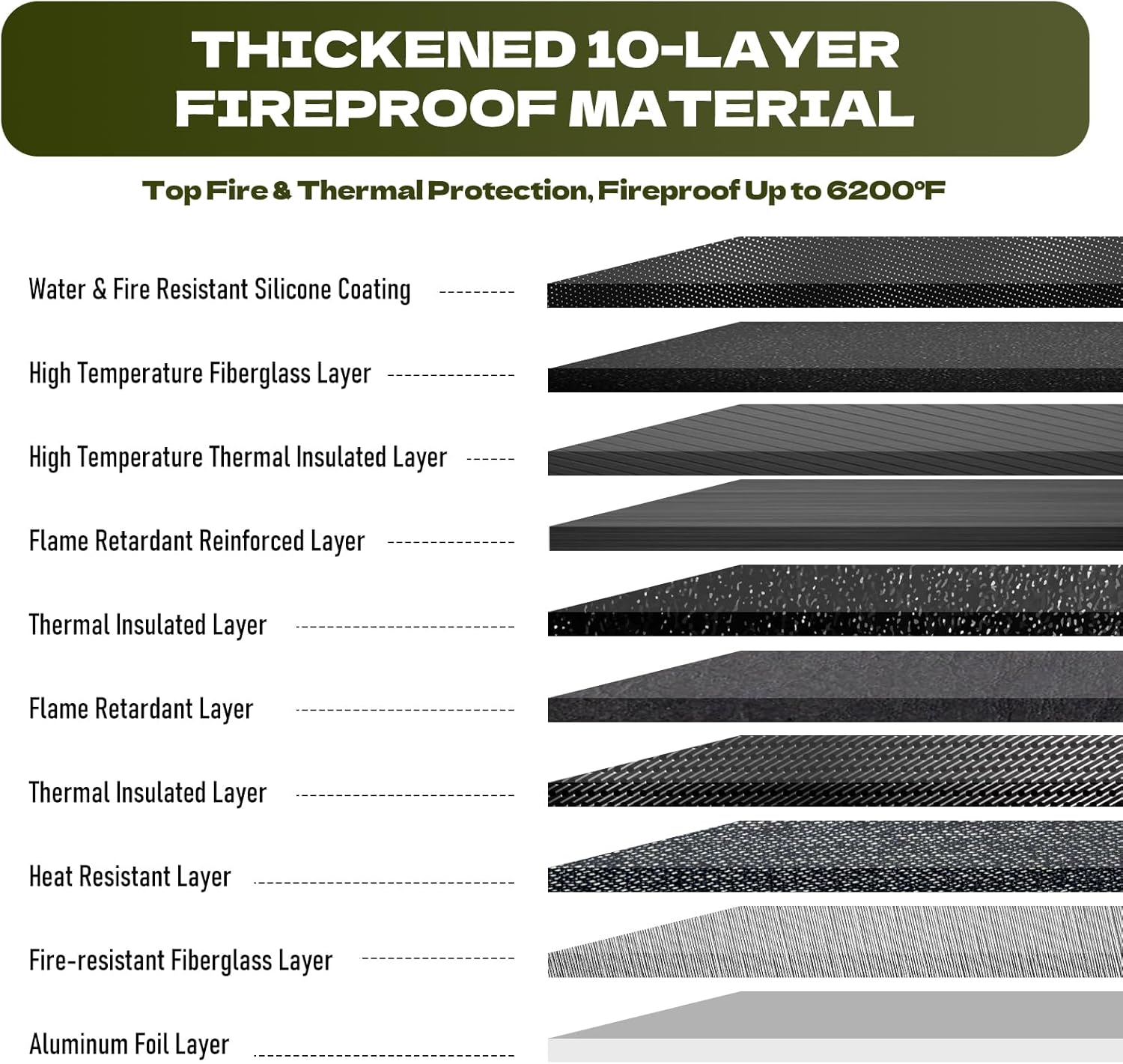 - 10-Layer Armor Against Extreme Heat: Engineered with a Silicone Coating Layer, 3x fireproof fiberglass layers, 2x Flame Retardant layers, 3x Thermal Insulation layers, and an aluminum foil layer, this fireproof document bag buys you precious time. Its science-backed layers slow heat transfer, giving you minutes to rescue valuables even in 6,200°F infernos—because every second counts