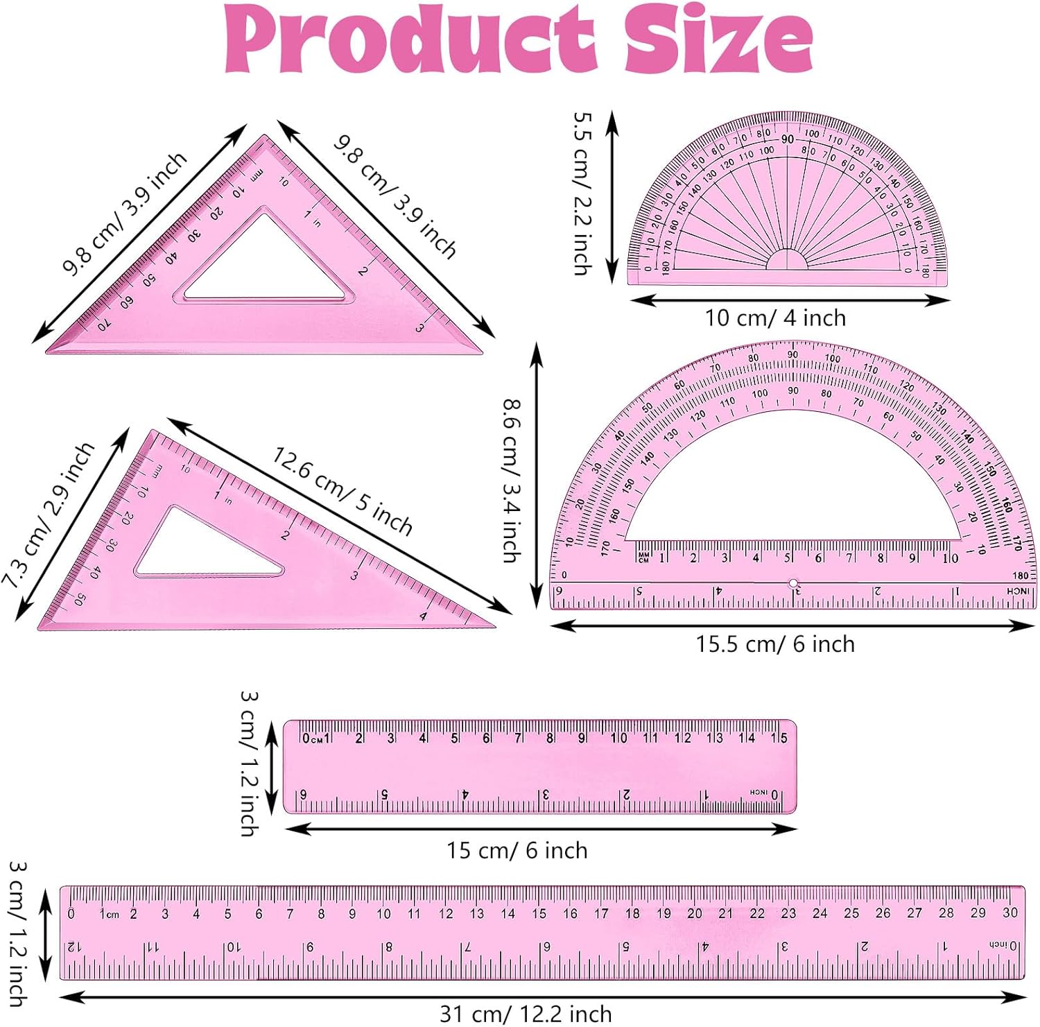 - Complete math tool set: you will be provided with 2 protractors of 15.5 cm and 10 cm, 2 triangle rulers of 45 degree and 60 degree, 2 straight rulers of 6 inch/ 15 cm and 12 inch/ 31 cm, totally 6 pieces; The complete combination meets the needs of various occasions, you can choose the right ruler to work according to your needs