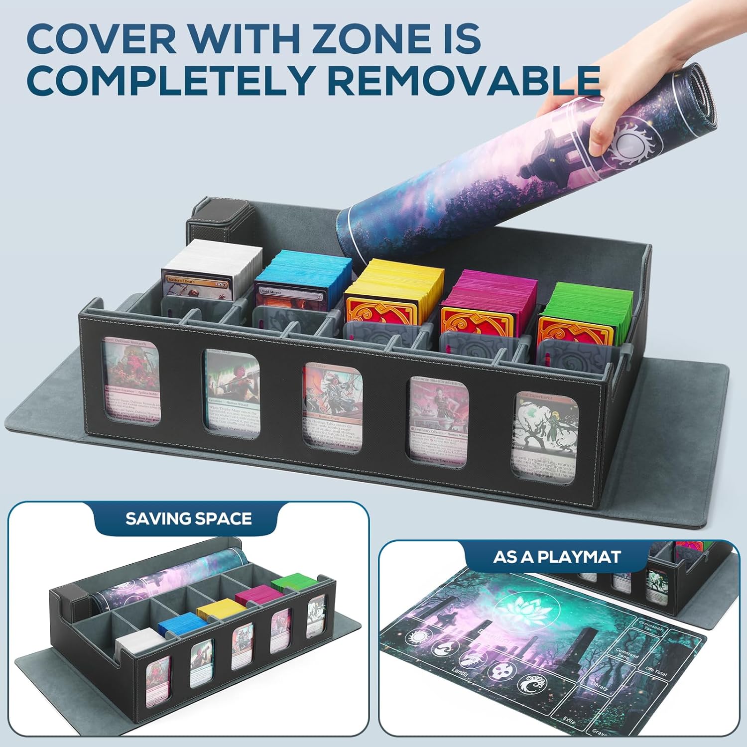- 【Professional-grade card support system】- This trading card organizer consists of a 5-row storage deck system, a game mat storage system and a sifter box with a variety of accessories: 5 clear boxes for Commander's cards, 5 built-in deck support brackets, and 36 markable dividers to ensure the vertical stability of the MTG Commander's Deck Boxes. The anti-collapse design works effectively whether it is fully loaded or half empty.