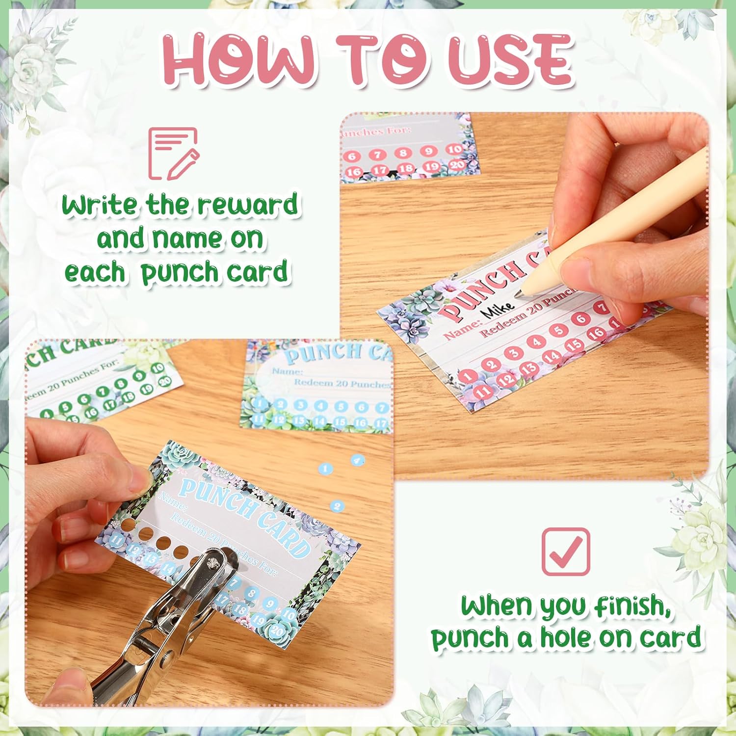 - Succulent Design: punch cards for kids at home has 8 different succulent styles with vibrant patterns and colors, printed with letters like 'punch cards', 'redeem 20 punches for', etc., simple and generous; Vivid and eye-catching, blank back design allows you to send other messages to students; Punch design 1 to 20 score, you can punch in according score
