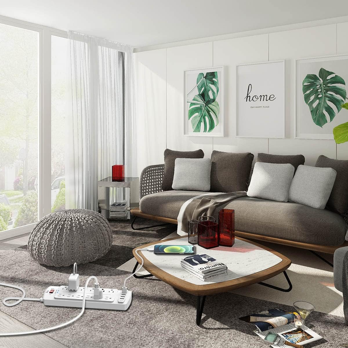 - 【Surge Protector Power Strip with usb】- 2 sets of outlets arranged on different directions, with 20-foot 15A/1875W power cord, easy to use for all types of adapters. 3 USB-A Ports and 1 USB-C Port total 3.4 A/17W, each USB A port features 2.4A Max output. USB C charging port features 3A MAX. Built- with smart technology, detecting charging devices and deliver optimal charging speed automatically, compatible with Kindle and most USB devices.