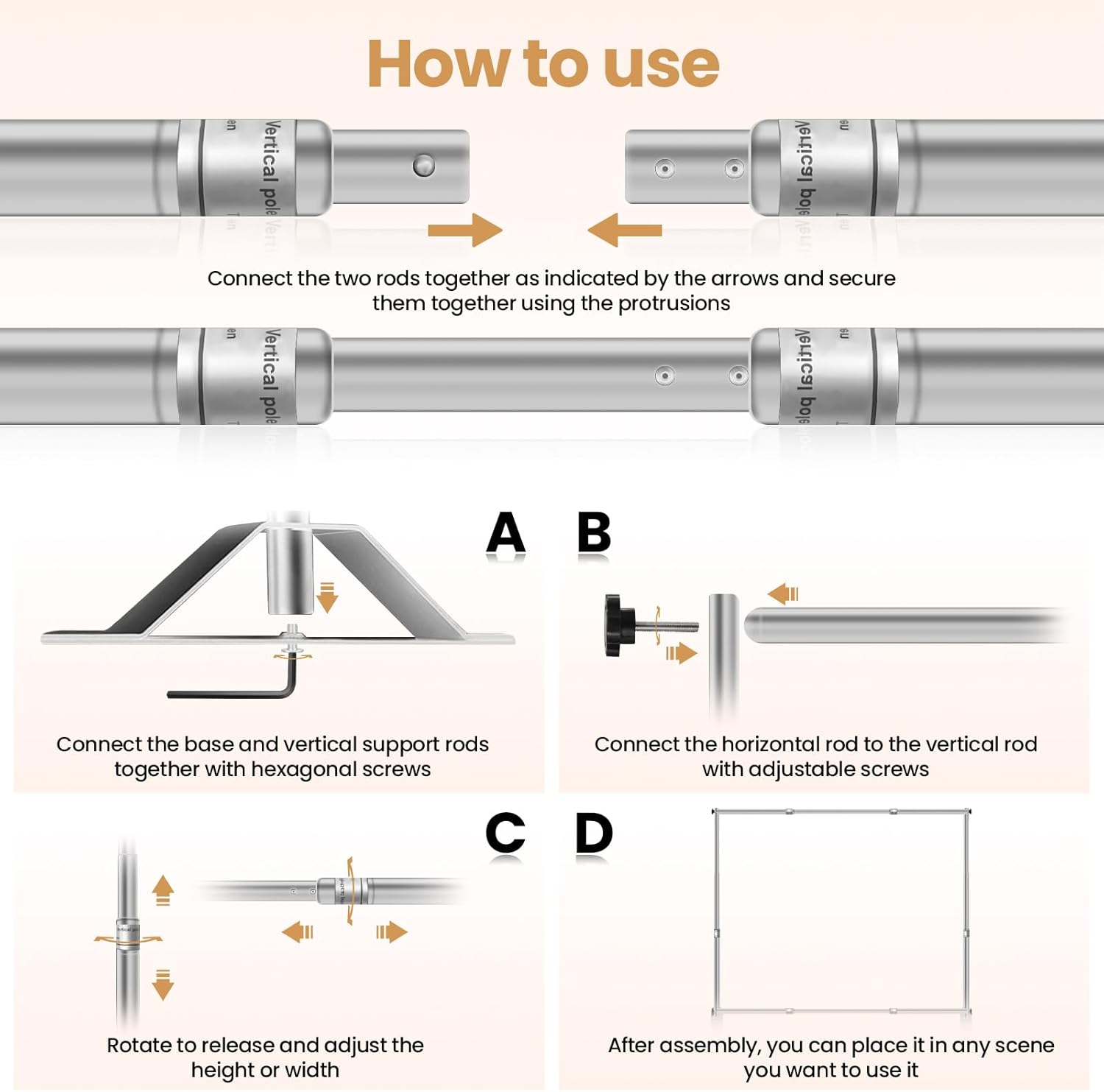 - 【Wide Application】The heavy duty backdrop stand is perfectly suitable for trade show, parties, conferences, promotion banner, weddings, birthday, baby shower, exhibitions, business events and so on. Photography backdrop stand can hang drapes, balloons to make your backdrop amazing, the carrying bag is convenient to store and transport it anywhere with you.