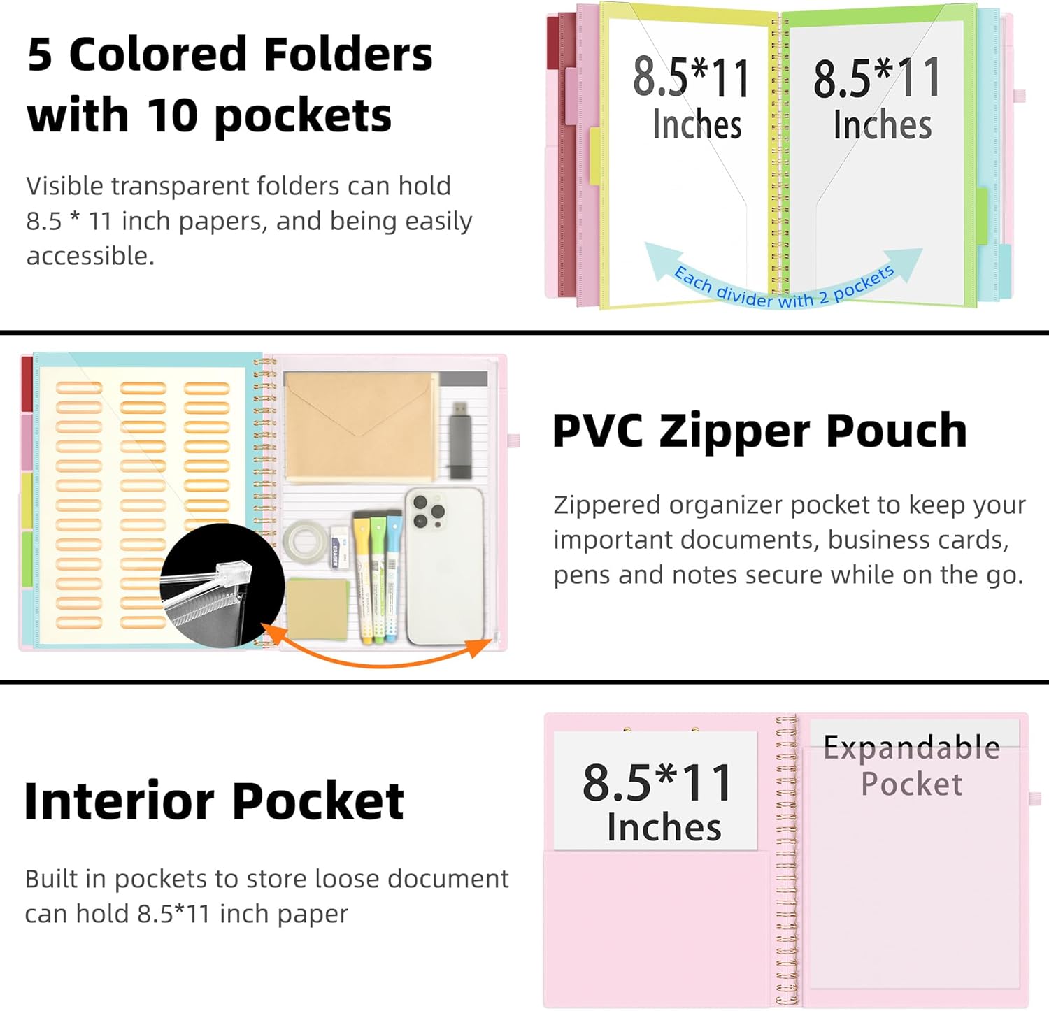Ospelelf Pink Foldable Spiral Clipboard Folio with with Storage Zipper Pouch, 5 Plastic Folders with 10 Pockets, Leather Clipboard Folder with Notepad, 39 Divider Label Stickers (Rose)