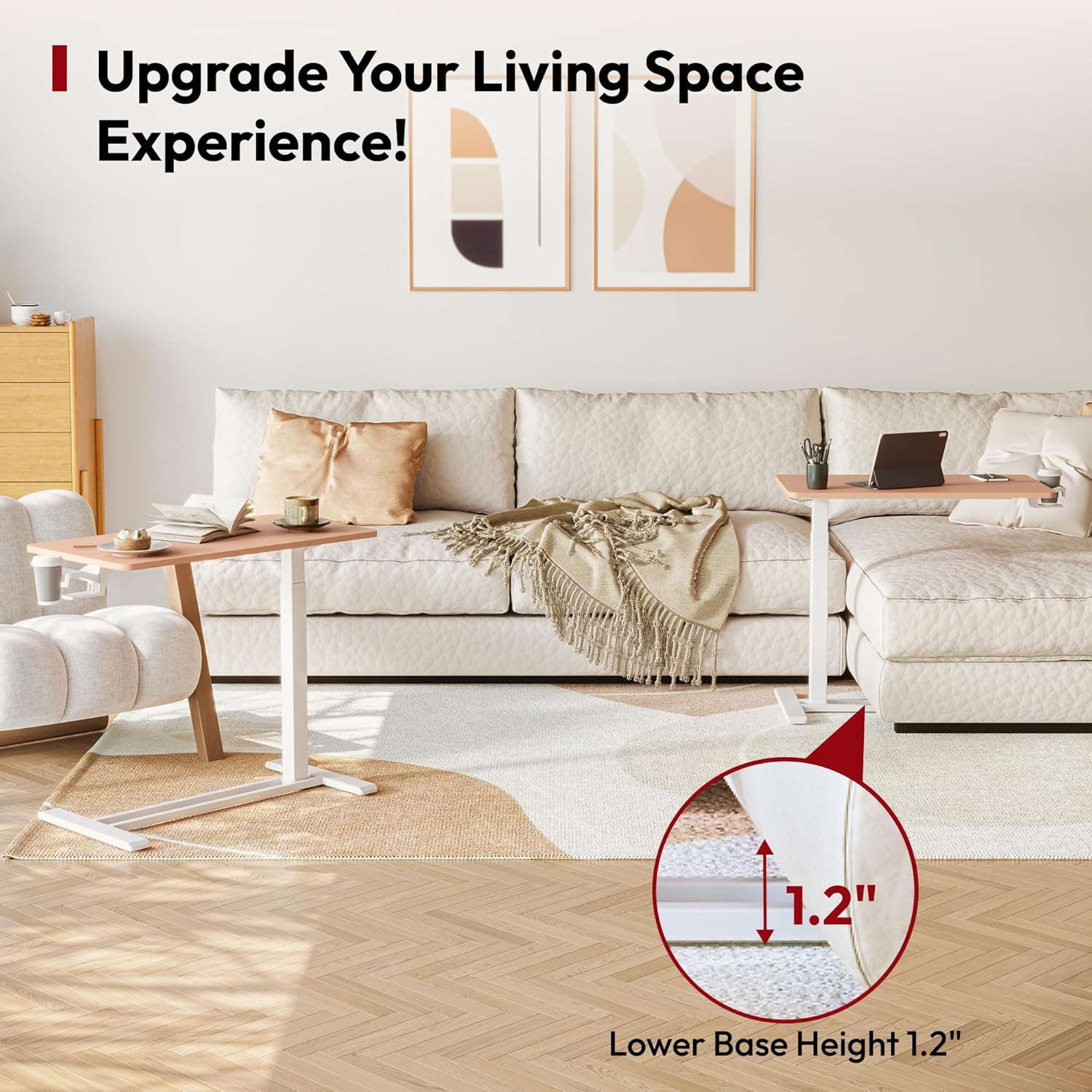 - Portable and Mobile – Designed for convenience, this rolling computer desk is ideal for work or study, whether at home or in the hospital. Its low-profile base with smooth-rolling wheels allows easy movement and tucks under furniture as low as 1.2 inches, saving space and enhancing adaptability.