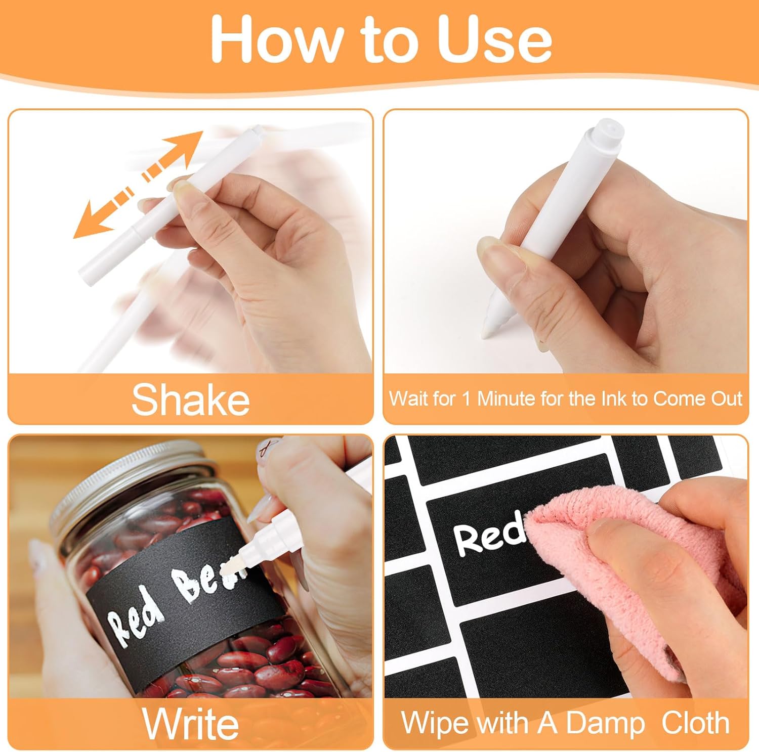 - Reusable Labels: The surface of the Chalkboard label is smooth and delicate, and the included white chalk strokes are smooth and clear; Please shake the chalk marker and wait for minutes to let the pen tip full with ink and then to write. Just wipe it with a damp cloth to clean it as new, and easily rewrite the content