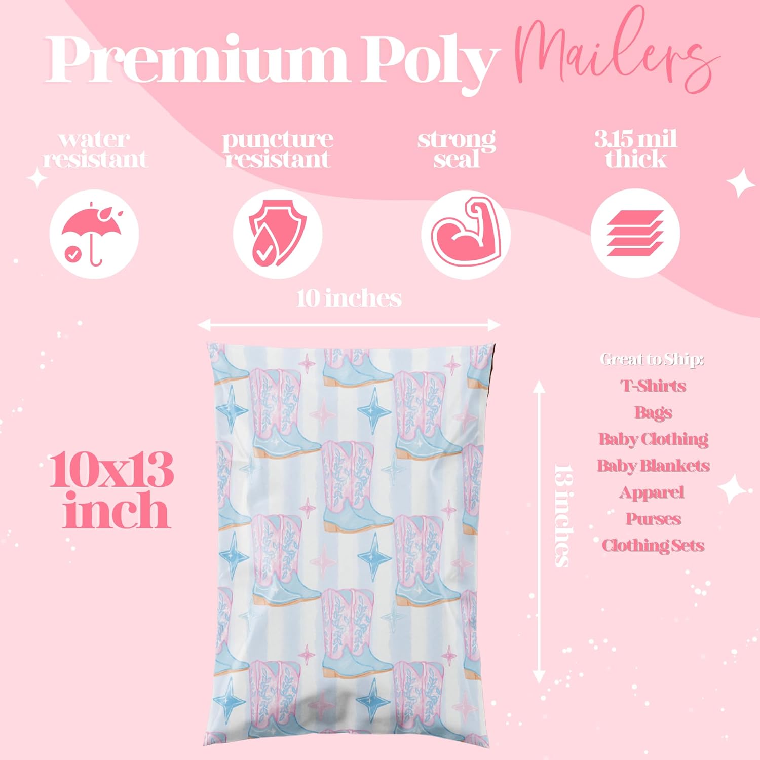 14.5x19 Designer Poly Mailer 100 Pack Heavy Duty Waterproof Self Seal Shipping Bags for Small Business Large Mailing Envelopes Bulk Tear Resistant Packaging Cowgirl Boots Western