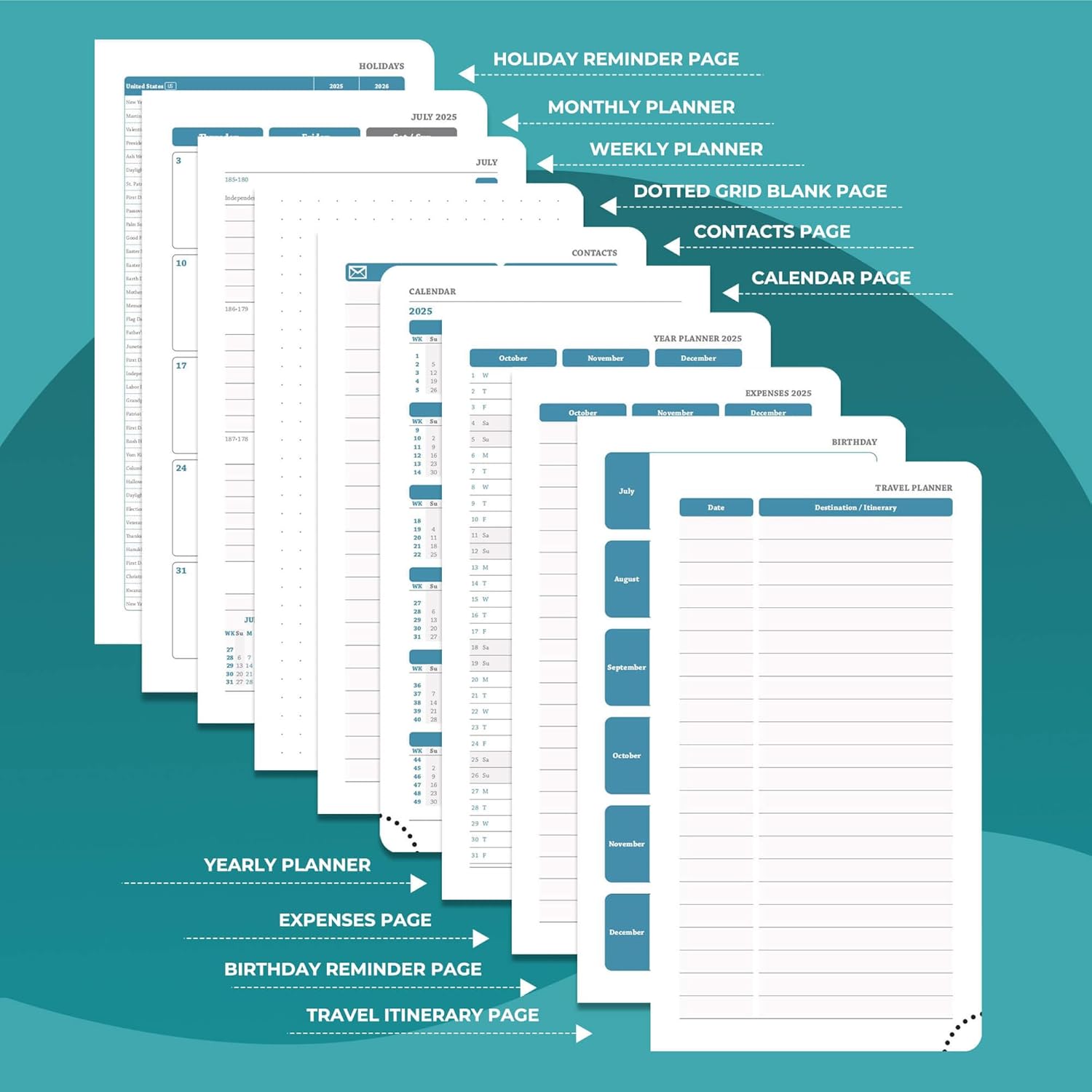 - Multi function Page: Personalized planner system. Year plan pages, holiday reminders, birthday record area for relatives and friends; set up storage contacts, and record inspiration and plans with the dot matrix note area; at the same time, work planner can travel planning and expense management modules to achieve coordination of schedule and finance