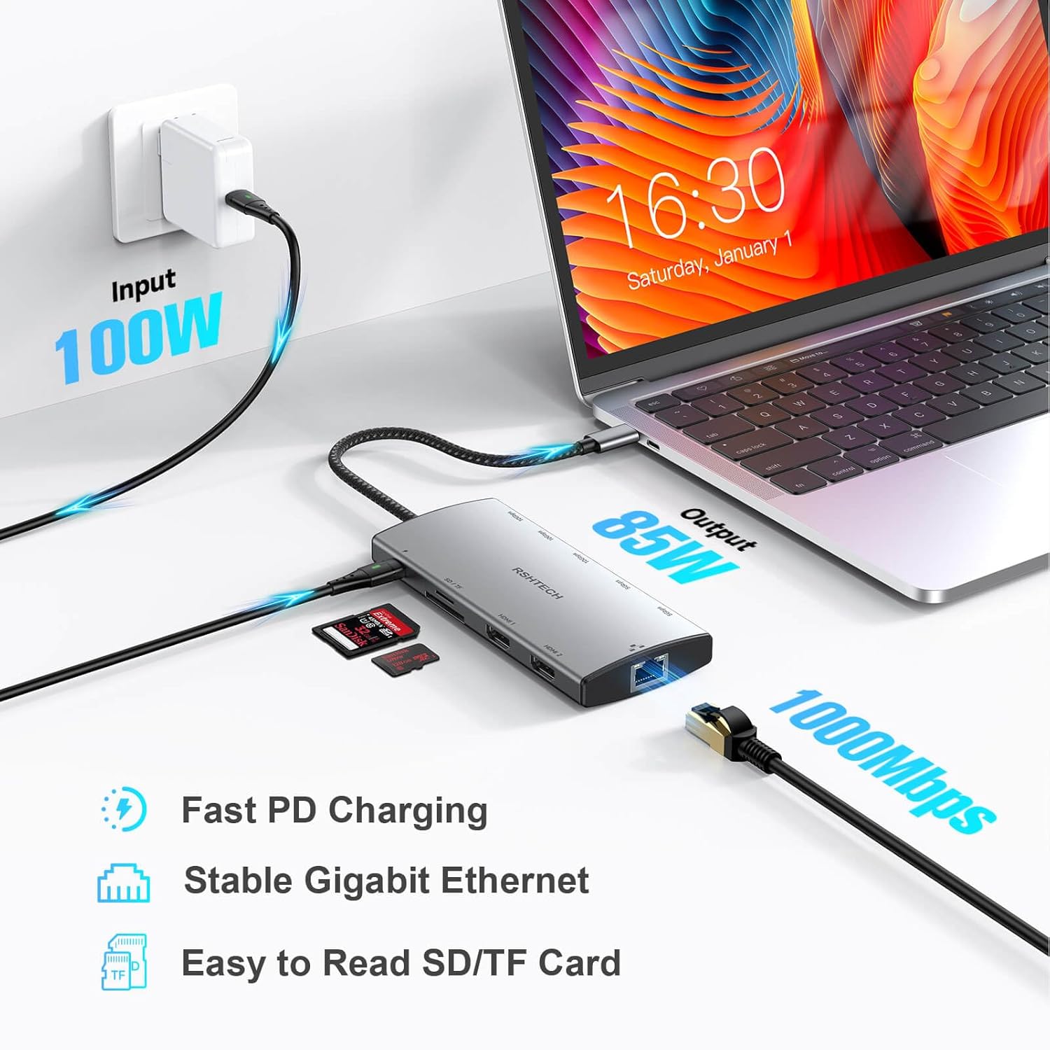 USB C Docking Station Dual Monitor, RSHTECH 11-in-1 USB C Hub Multiport Adapter with 2 HDMI 4K/8K, 3 USB 3.2 Ports 10Gbps(2C+1A), 2 USB 3.0 Ports, 100W PD, Gigabit Ethernet, SD/TF Card Reader