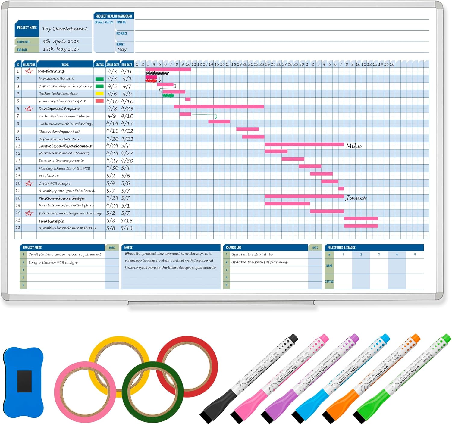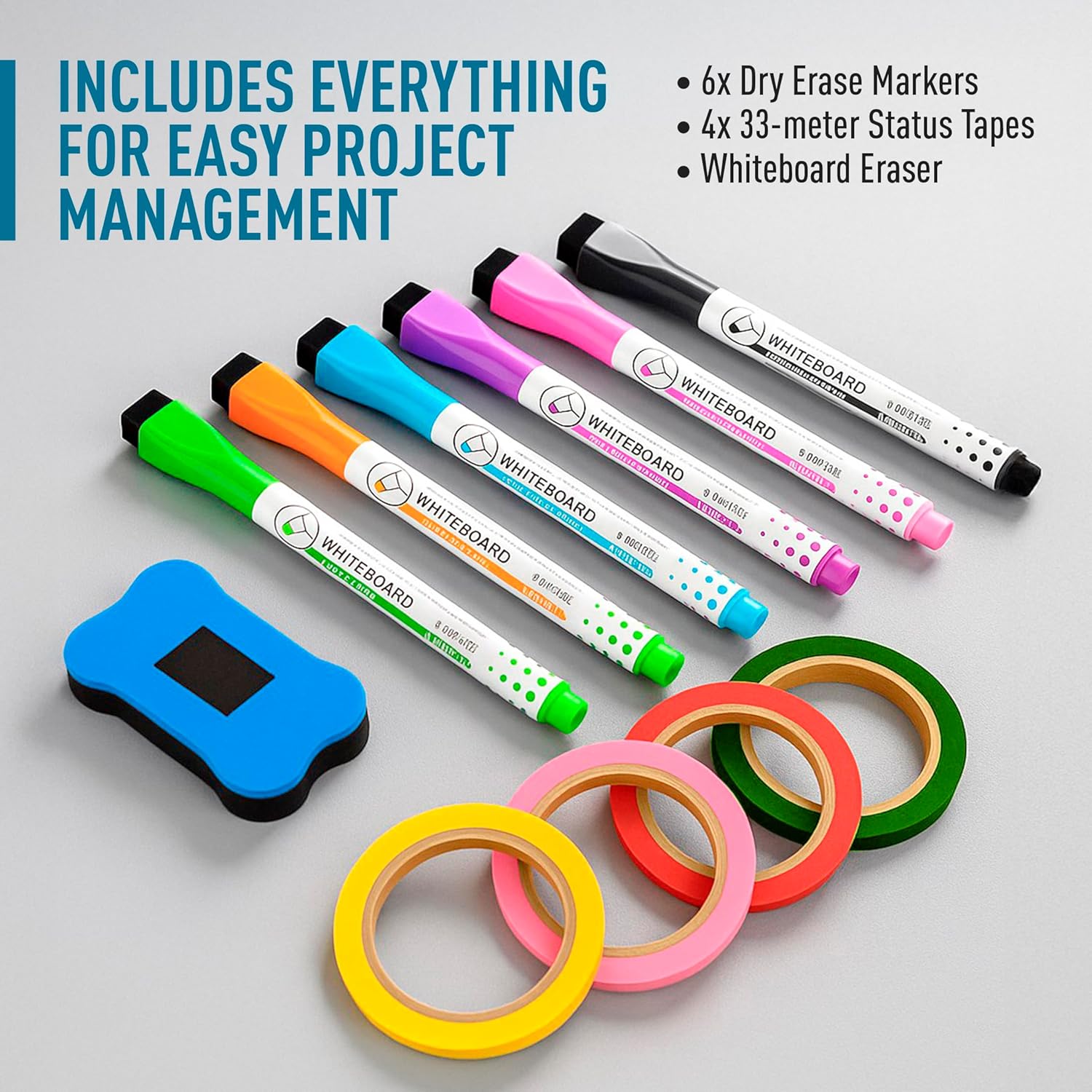 - Complete Project Kit – Board, 6 markers, eraser, wall hardware, tray, and 4 rolls of color-coded tape to plan timelines and track task status.
