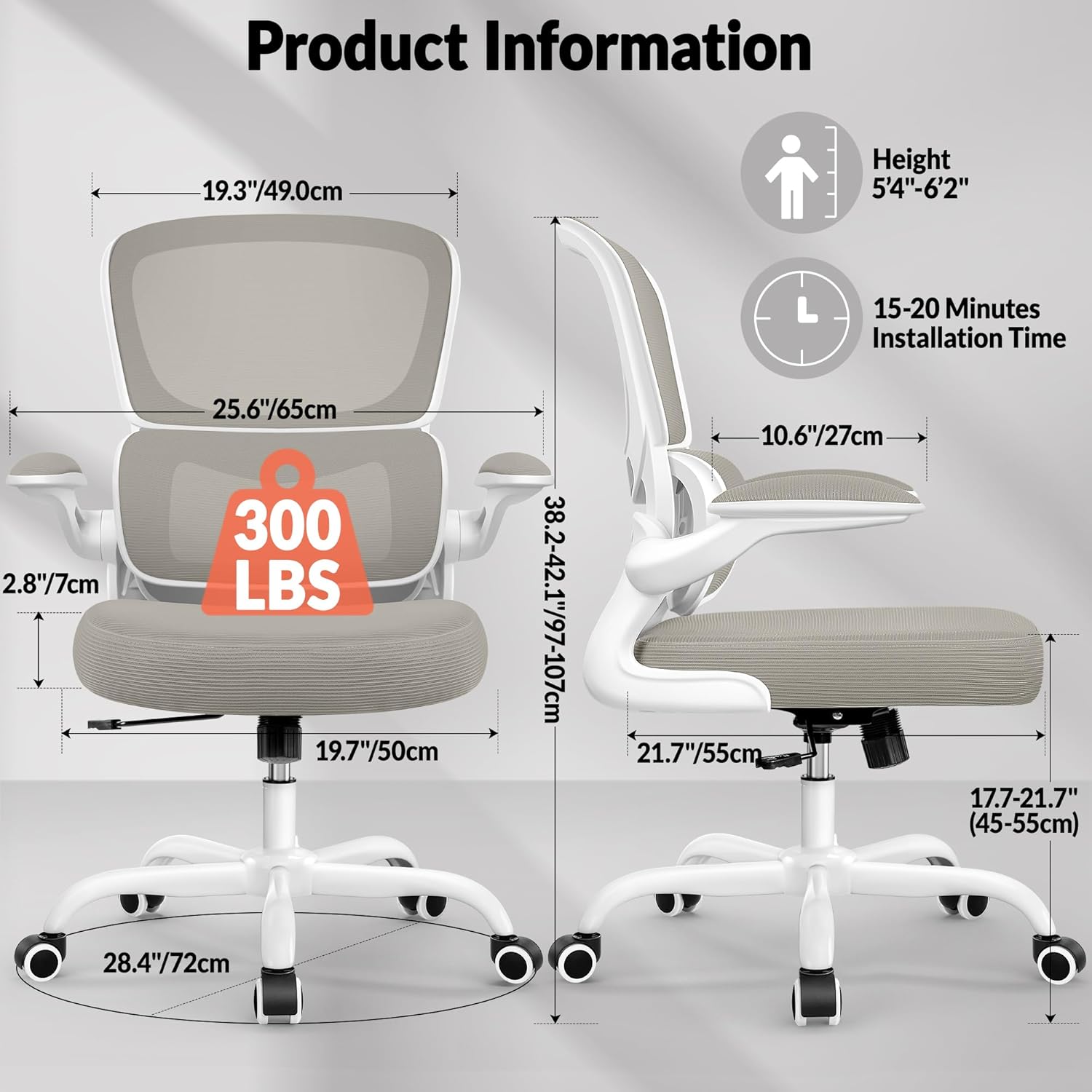 - 【Adjustable 90° Flip-up Armrests】Customize your seating experience with flip-up armrests that can be adjusted to suit your preference. The padded armrests reduce elbow strain, and when raised, the comfy desk chair can easily slide under your desk, saving valuable space.
