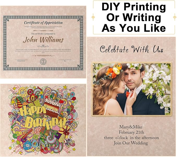 - Work As Different Things: these plain certificate papers are flexible in use, you can use them as certificate printing, wedding invitation, birthday invitation, restaurant menu, theme party decoration and so on, running smoothly in laser and inkjet printers, copiers and offset applications without jams