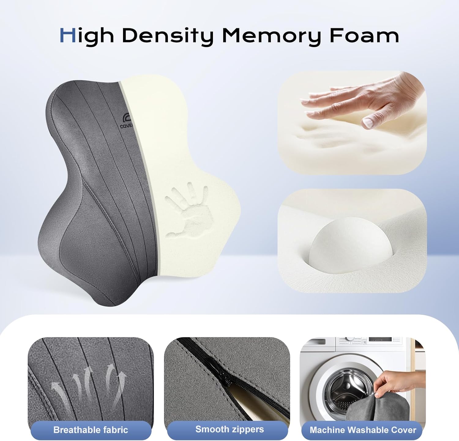 Coverado Car Lumbar Support Pillow and Car Neck Pillow Kit, Ergonomic Design Car Headrest Pillow for Driving, Relax Back Head Muscles Relieve Driving Fatigue, Breathable & Removable Cover, Gray