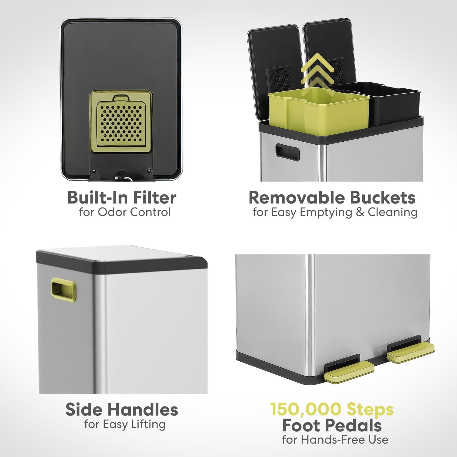 - HANDS-FREE USE: The stainless-steel foot pedal stands up to daily use and removes the need to touch the lid during waste or recycling disposal to keep hands clean.